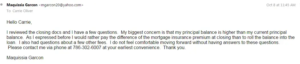 In October I was contacted by Carrie Oliver with the option to take advantage of a streamline refinance. She explained to me that I would be charged a new mortgage insurance premium but I would be reimbursed about $1800 from my previous policy. The difference of $1000 ($2800 - $1800 = $1, 000) could be paid at closing instead of being added to the principal. With that said I agreed to the refinance. Later my closing documents were sent to me and my principal had increased about $2, 300. And my cash to closing was $7. I contacted Mishon Simmons to communicate my concern with the principal increase. I explained to her what I discussed with Carrie and she said she would share my concerns with the loan officer. I have gone through 3 loan officers and have communicated with over 7 Freedom Mortgage employees about this issue and it is still not resolved.