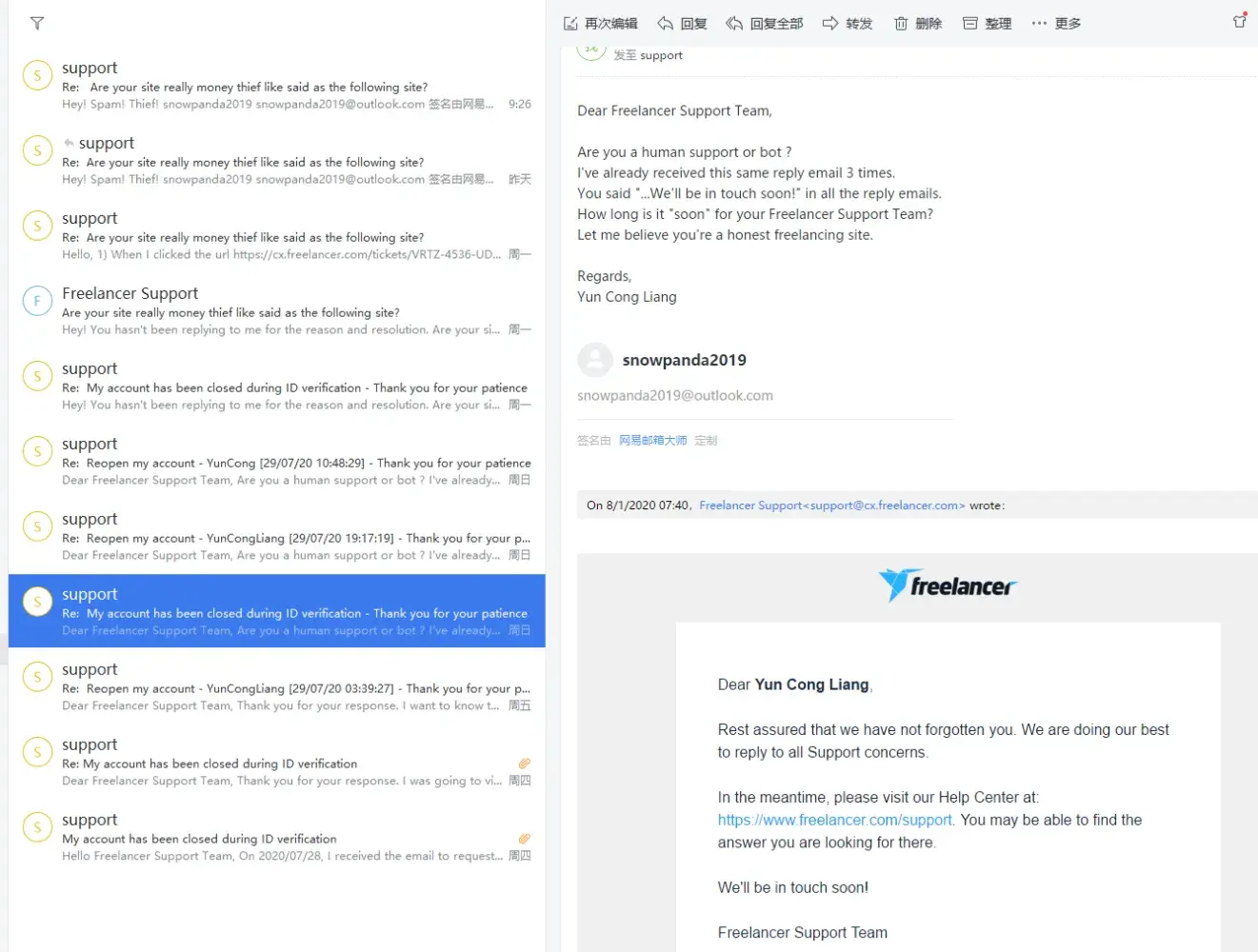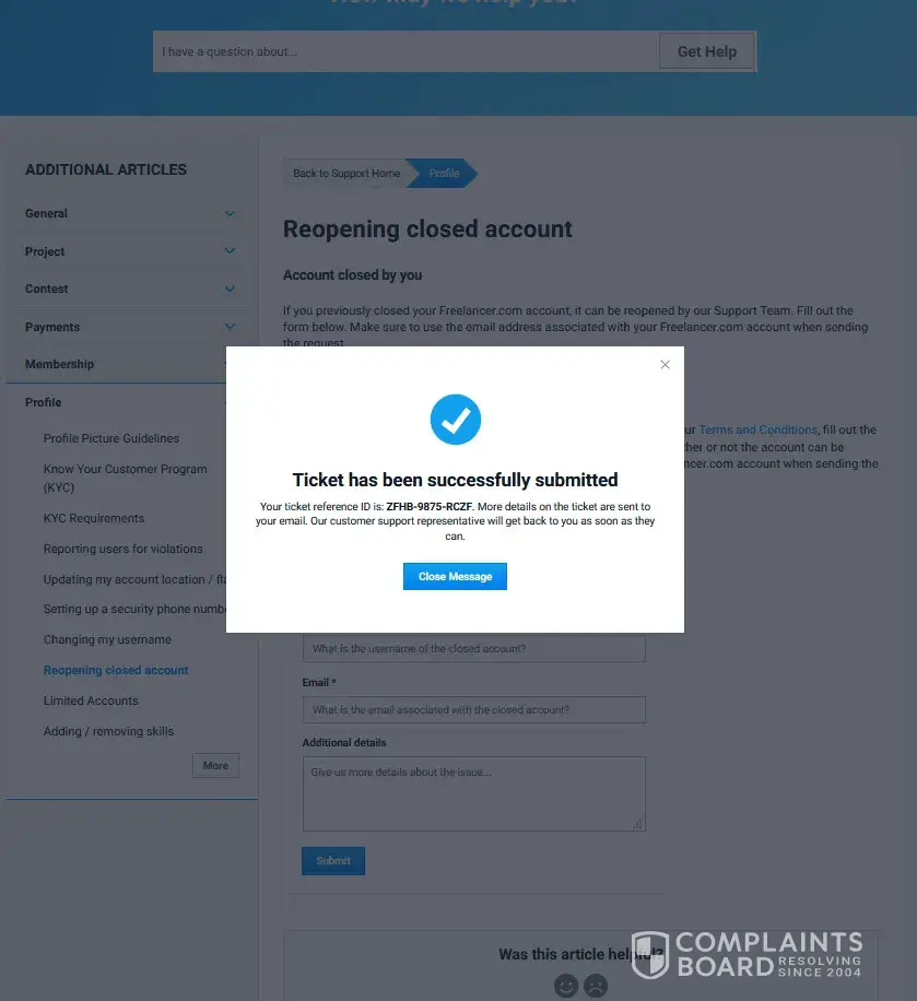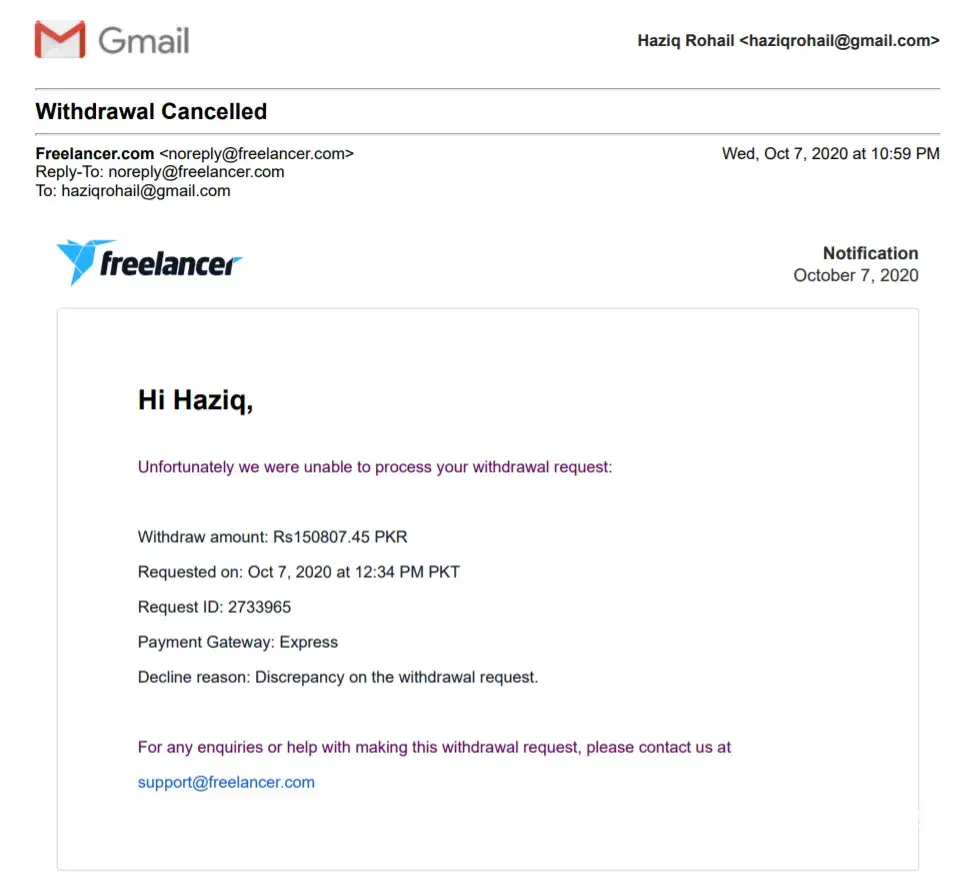 In the evening, I continued to email them [protected]@freelancer.com and submitted my complaint on the website. I continued to email their support to recover my funds, only to receive their typical automated reply: We understand your concerns + email template.