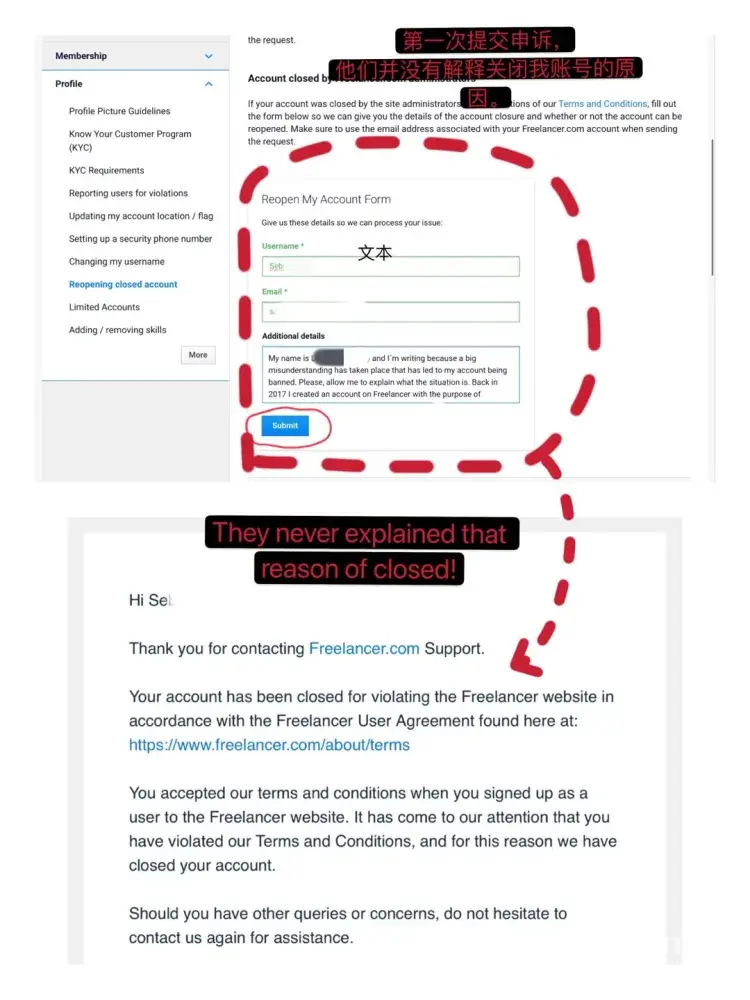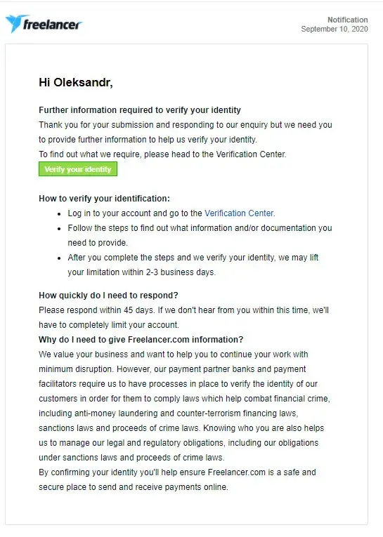 On 9 September I got from Freelancer notification that I have to verify my identity. I did it, and on 10 September evening I got an email "Further information required to verify your identity. Thank you for your submission and responding to our enquiry but we need you to provide further information to help us verify your identity.Please respond within 45 days. If we don't hear from you within this time, we'll have to completely limit your account". I didn't have time to fill out the form that day and thought that I could do it on the next day. On September 11, 2020 early morning I found out that my account is closed. The point is that I didn't receive any notifications about it. I filled out the form "Reopening closed account" a few times but I didn't receive any emails/ feedbacks to my mailbox. At this moment I want to know what is the reason to close my account and how I can withdraw my funds in amount of ~5, 5 USD!