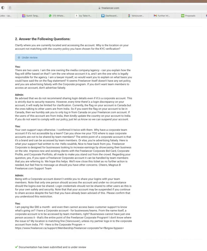 I point out that I was advised team members could access the account. And the entire point of a media agency corporate account is that people in the agency can access it. I ask them where the ToS mentions Freelancer Corporate account holders cannot have team members accessing it.