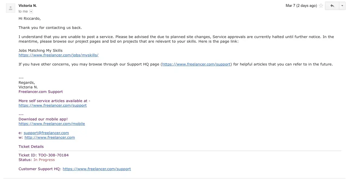 The customer service has answered to me several times that the service is unavailable and they'll let me know when it will be reactivated. Last february I asked to tell me at least a date on when the service will be reintroduced but the employee wasn't able to tell me. I'm waiting for the last 6 months to add my services. They keep saying that the service isn't active but new users activate their service just after been registered in freelancer. com!