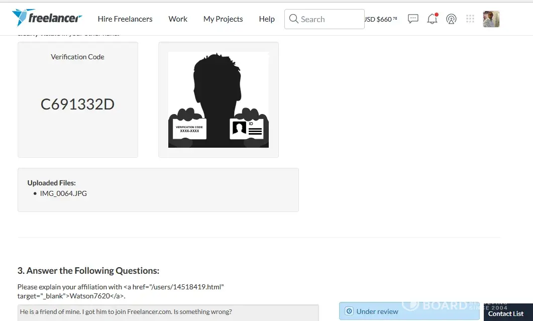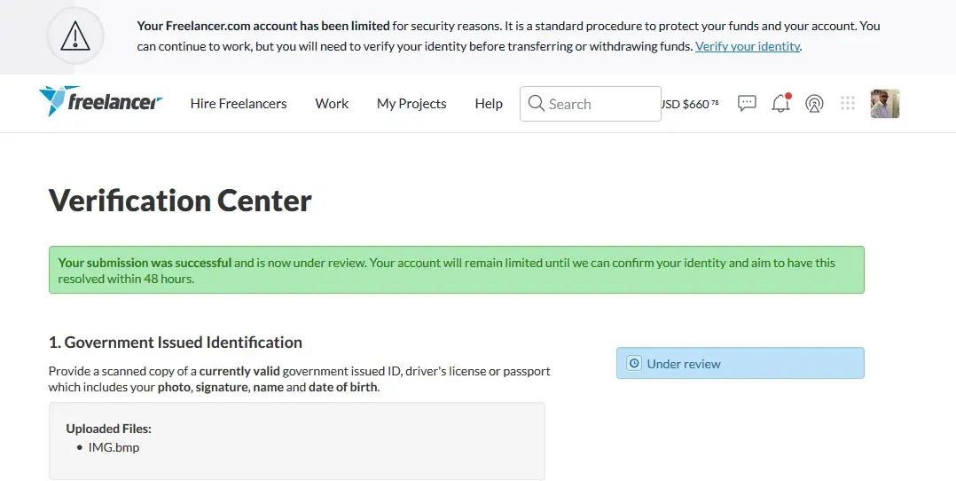Out of no where my account was limited and I was required to submit identity documents. That was completed with no problem. On the website it says this is usually resolved within a 48 hour period, and in the email it says within 72 hours. That timing conflict needs to be resolved, but that's another story. During my submission of identity documents I was asked if I knew a particular person. I had to figure out who this person was because the given links did not work. Just so happen I was able to figure out the person because their username is the same as their email address. What's the biggest headache is that this is affecting the projects that I currently have in progress. Two developers I hired had issues with their accounts because of my account being limited, and I have this problem I guess because of someone else. Something needs to be done, because this is crazy. I submitted all required documentation. I felt like a fool taking a picture with my ID in one hand, the printed verification number taped to my chest because I had to use the other hand to snap the image.
