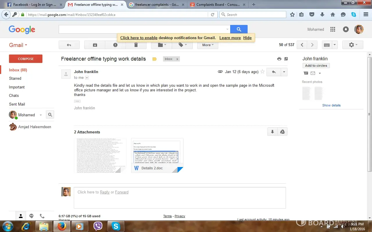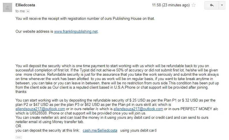 i am a member of freelancer. someone chatted and asked my mail id to give a retyping job. i gave my email id. than they said to deposit 17$ to start the job. i paid through paypal to the above email id (1st one) than they sent 25 images to type in to notepad finish it within 4 days. they said they will pay 3$ per page. i did and sent to them. after that no response. they cheated me. i sent many mails to those email id's they didnt even response. the email id which they use John franklin, [protected]@yahoo.com, [protected]@gmail.com