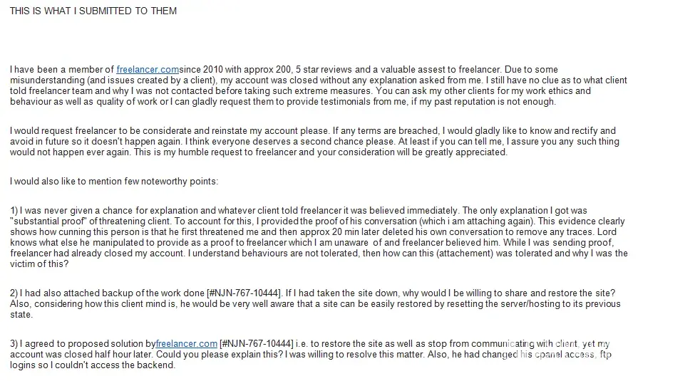 I have been a member of freelancer.com since 2010 with approx 298, 5 star reviews and a valuable assest to freelancer. Due to some misunderstanding (and issues created by a client), my account was closed without any explanation asked from me. I still have no clue as to what client told freelancer team and why I was not contacted before taking such extreme measures. Attached are all proofs