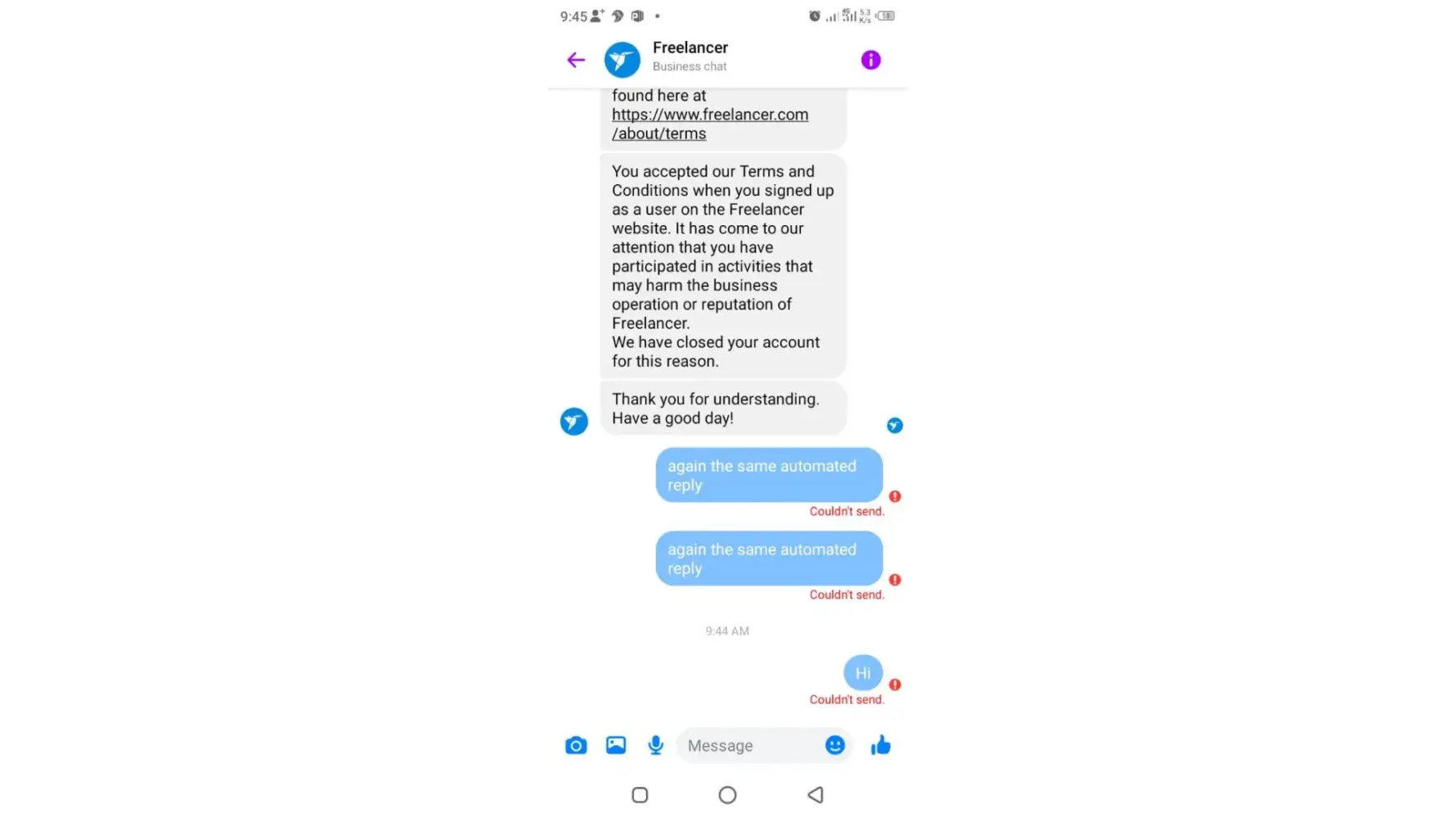 Furthermore, Freelancer.com has failed to provide any valid reason for the closure of my account. I have been a loyal and active user of the platform for about 5 years, during which I have complied with all the terms and conditions set forth by Freelancer.com. There has been no indication of any violations on my part that would warrant such drastic measures, let alone the complete seizure of my funds.