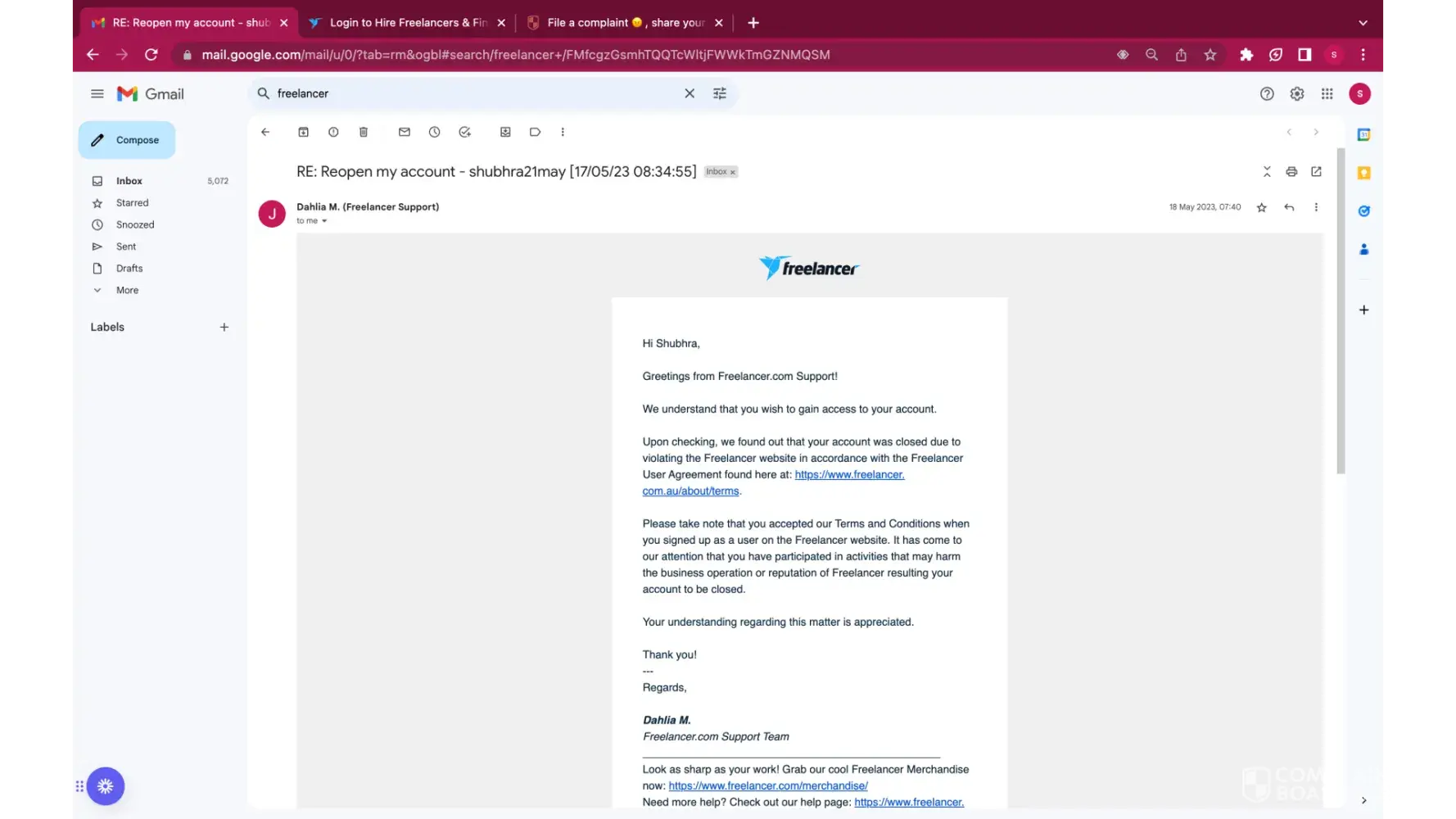 On 07/20/2023, without any prior notice or warning, I discovered that my Freelancer.com account, registered under the username falaksafi, had been terminated. To my utter disbelief, I was denied access to my account and unable to log in to retrieve essential information, ongoing projects, and funds associated with my account balance.