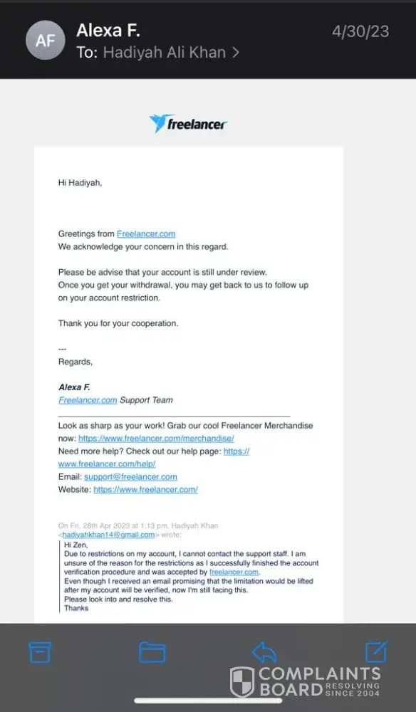 On (3 May 2023), I attempted to log into my Freelancer.com account and was greeted with a message stating that my account had been suspended for violating the platform's terms and conditions. I was not provided with any explanation or evidence of what specific terms and conditions I had violated. Despite multiple attempts to contact Freelancer.com's support team for clarification, I have received only generic responses and no further explanation.