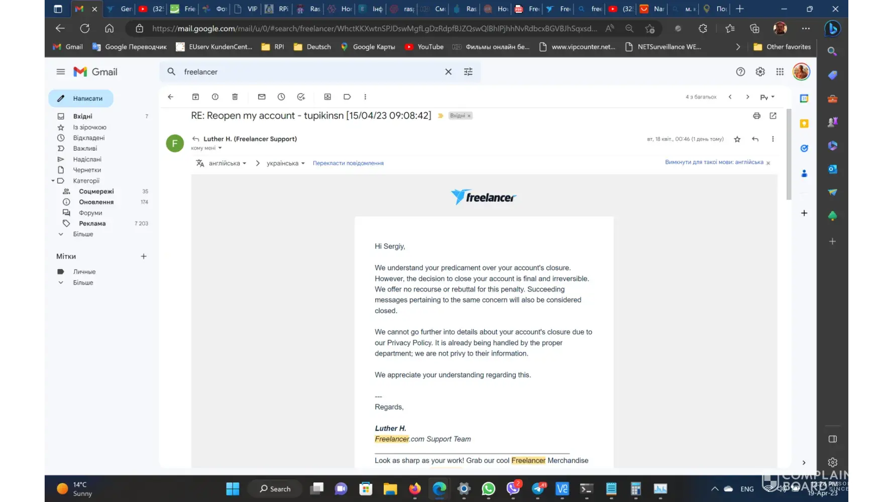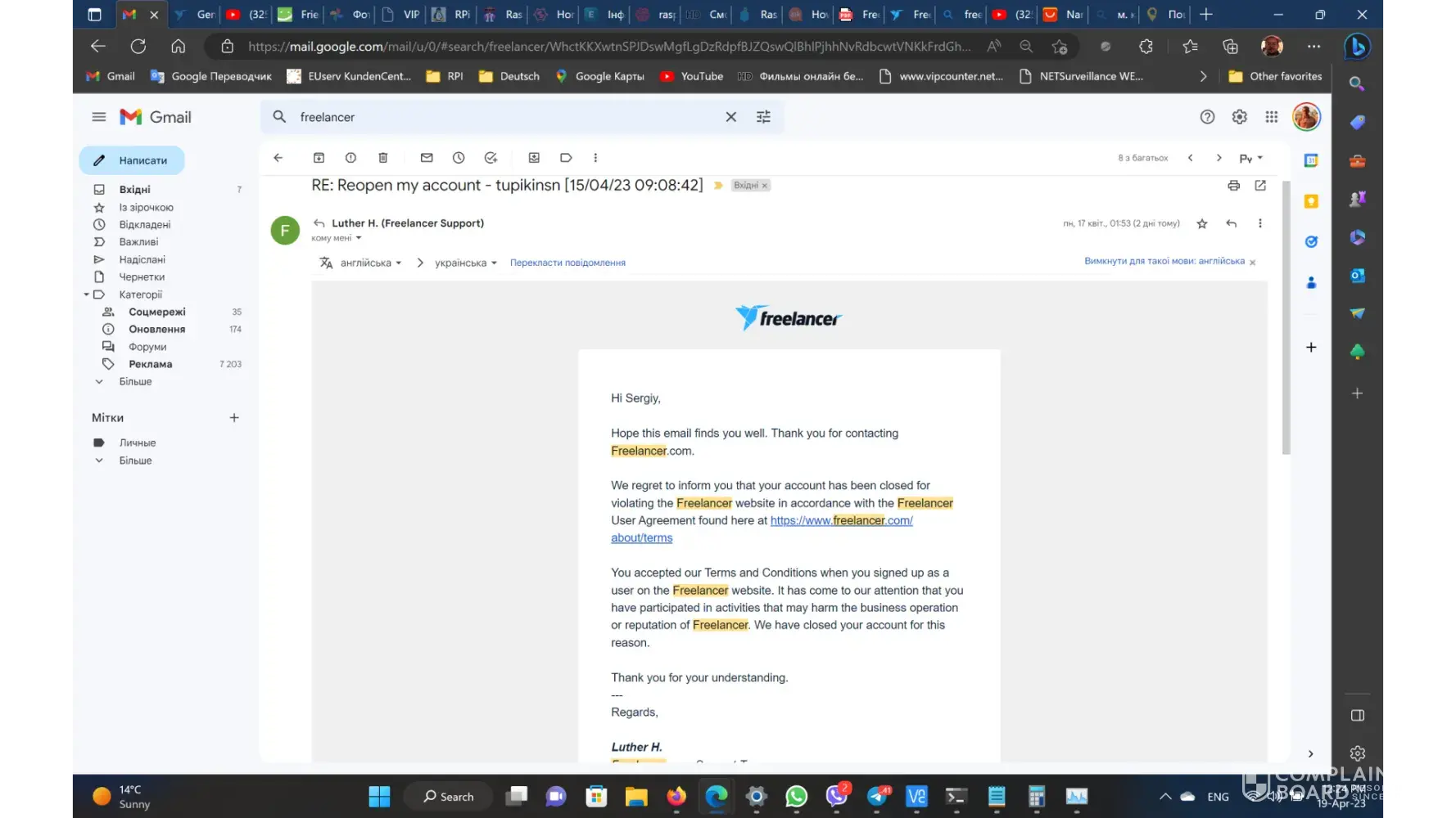 They have closed my account without any reason 03/14/2023. And yesterday is the day my withdrawal opening is to end. I had an ongoing project there and had over $300 I have earned from many clients. They said that I did irregular activities but obviously I really didn't do anything against the freelancer rules and tried to keep the terms and conditions. Being successful as a freelancer was my greatest dream, but now I couldn't make my dream comes true. I have contacted with support team several times but they always give me some reply like this.