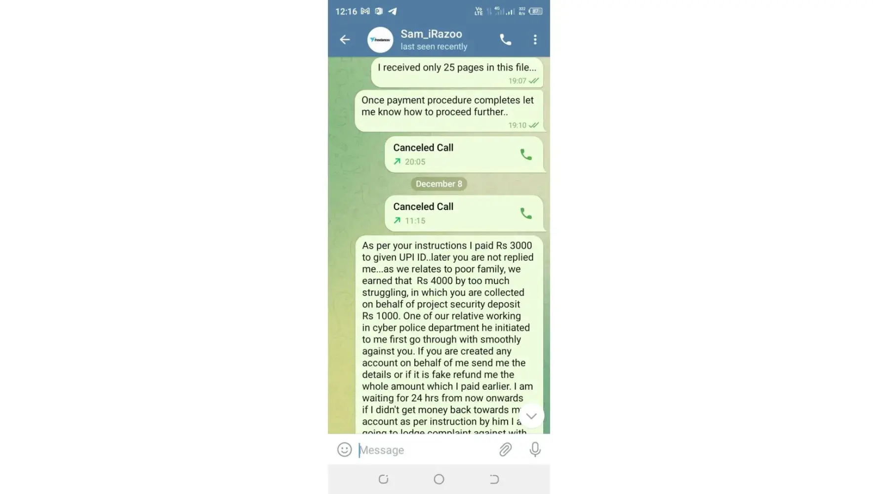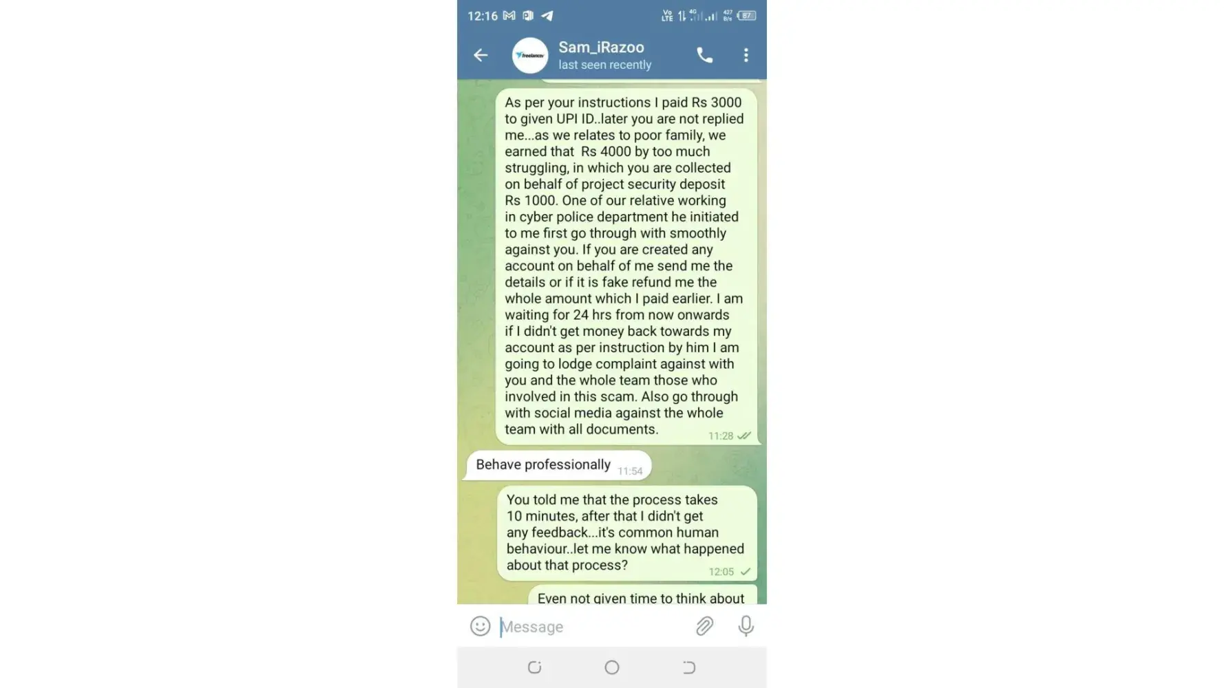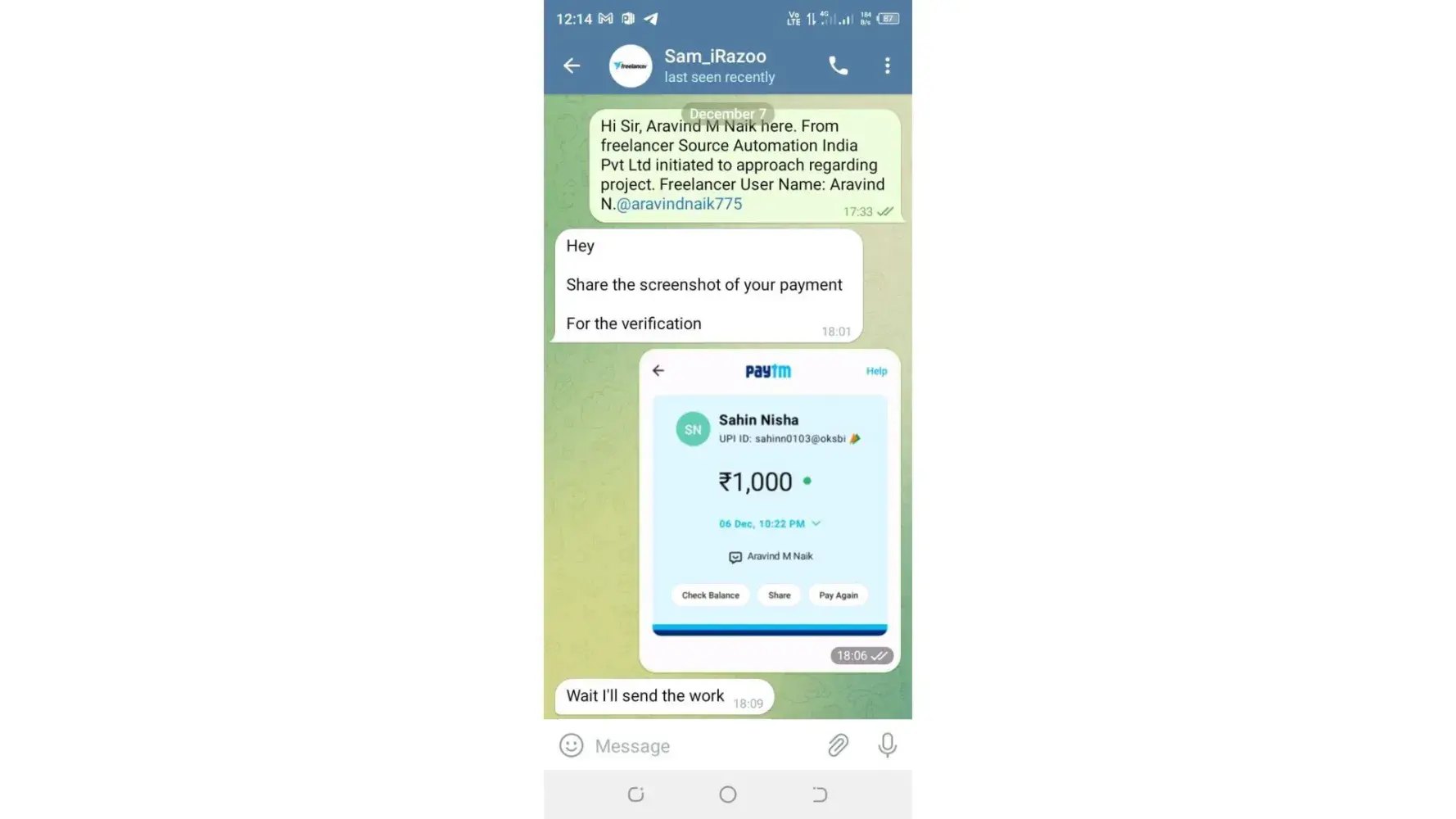 I Freelancer User [edited] and looking for data entry jobs which can be done from home. I choose this platform to continue my professional career. Recently I applied for bid, for that I get response from Aima F.@mairafirg and suggested me to give Freelancer Username , Name , Age and Country Name to their email: [protected]@gmail.com then I sent details through email. As per their instruction I submitted the filled form through https://freelancer-data-work-form01.paperform.co/ .With some terms and conditions they initiated to pay Rs1000 to [protected]@oksbi as security deposit and to fill with duly signed contract form and technical instruction form. After submission of both these form and security deposit acknowledgement, they initiated to contact @iRazoo_samual with telegram app. Later he initiated me to send the screenshot of security deposit 1000Rs to verify and to assign project. Then I sent him screen shot of security deposit which is paid to [protected]@oksbi account for the project plan 1. After verification he sent me 25 pages jpg file. Later he immediately initiated me to give international bank account details for the payment purpose. When he knows I didn't have any international bank account he told me to call with telegram app, he will suggest solution. After calling through telegram, he told me that many of freelancer users didn’t have international bank account, for such users they create account within freelancer platform for all types of currency transactions for that purpose we need to pay extra 3000Rs to create account. This process takes only 10 minutes, once the account is generated, he will share login details to me later we can withdraw this amount. (He didn’t give me time to think and quickly responding until rest of the payment transfer). He initiated to pay 3000Rs for the same UPI id [protected]@oksbi in which I have already paid security deposit 1000Rs. As per his instructions I paid Rs 3000 for the same UPI id. Once the money transferred to that account, he stopped responding to me. He told me the whole process takes 10 minutes time once the process is completed, he will send login details to me. I have waited for reply but no response from him. I started conversation with him to refund the money otherwise I will lodge the complaint against him and those who involved in this scam. He blocked and deleted all the conversation chat, but he doesn’t know I have already taken the screenshot. I gave him 24 hours’ time to refund, but he is not refunded. Whole these situations I explained with mail to original source [protected]@gmail.com and initiated them to refund my money. But they don’t give any response. I have attached all details for your kind reference. Please go through it and take necessary action to avoid other users couldn't face same problem in future which I faced, also suggest them to refund my payment. Hope you will do the needful.