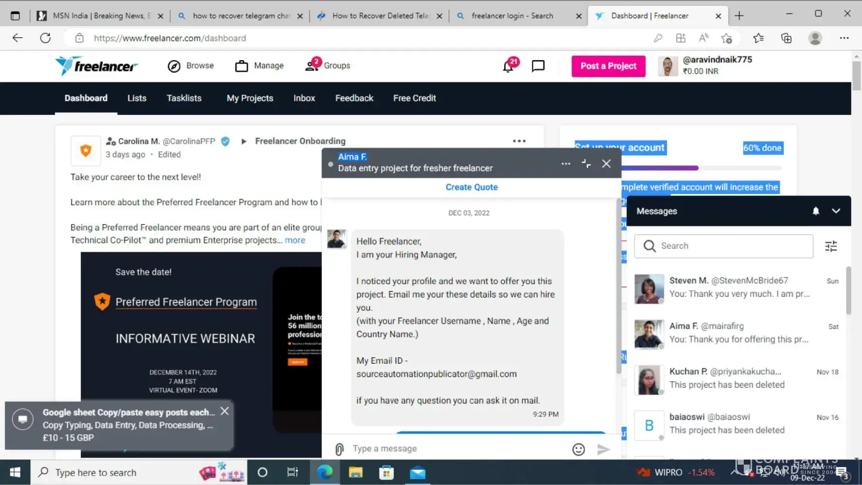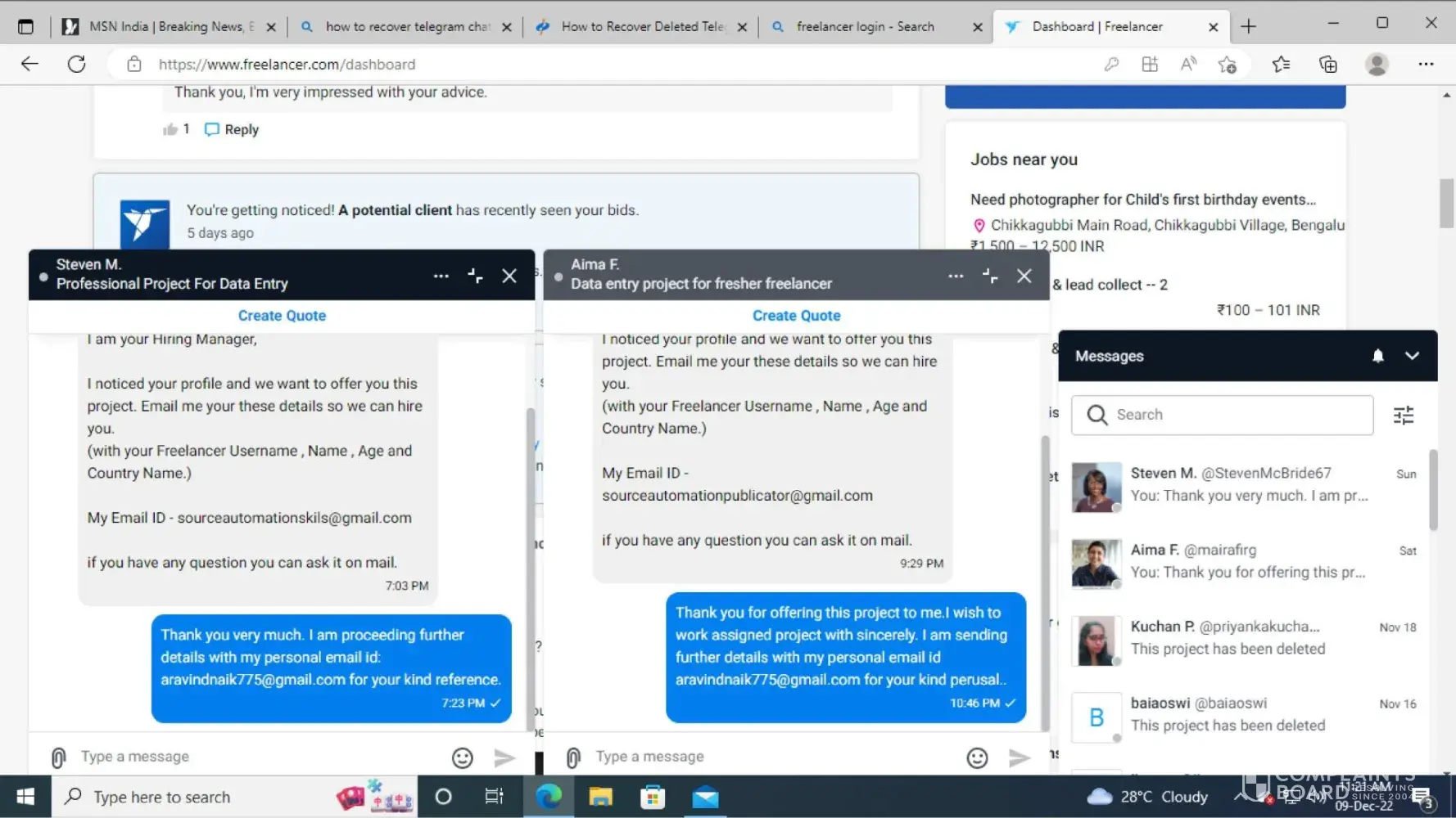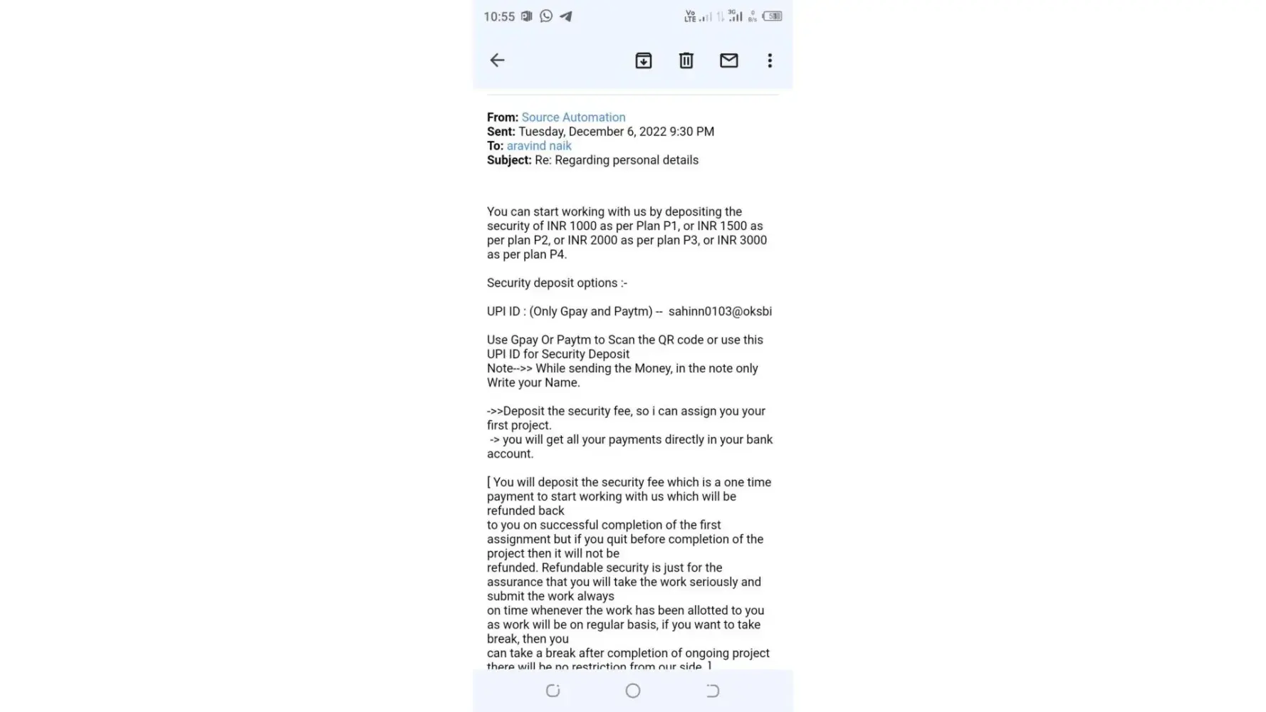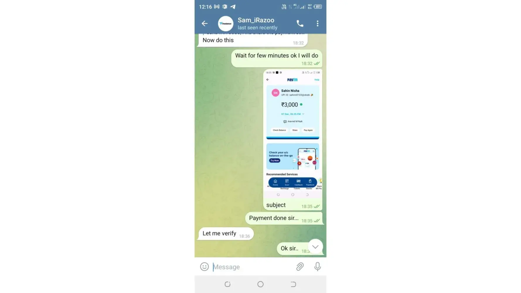 I Freelancer User [edited] and looking for data entry jobs which can be done from home. I choose this platform to continue my professional career. Recently I applied for bid, for that I get response from Aima F.@mairafirg and suggested me to give Freelancer Username , Name , Age and Country Name to their email: [protected]@gmail.com then I sent details through email. As per their instruction I submitted the filled form through https://freelancer-data-work-form01.paperform.co/ .With some terms and conditions they initiated to pay Rs1000 to [protected]@oksbi as security deposit and to fill with duly signed contract form and technical instruction form. After submission of both these form and security deposit acknowledgement, they initiated to contact @iRazoo_samual with telegram app. Later he initiated me to send the screenshot of security deposit 1000Rs to verify and to assign project. Then I sent him screen shot of security deposit which is paid to [protected]@oksbi account for the project plan 1. After verification he sent me 25 pages jpg file. Later he immediately initiated me to give international bank account details for the payment purpose. When he knows I didn't have any international bank account he told me to call with telegram app, he will suggest solution. After calling through telegram, he told me that many of freelancer users didn’t have international bank account, for such users they create account within freelancer platform for all types of currency transactions for that purpose we need to pay extra 3000Rs to create account. This process takes only 10 minutes, once the account is generated, he will share login details to me later we can withdraw this amount. (He didn’t give me time to think and quickly responding until rest of the payment transfer). He initiated to pay 3000Rs for the same UPI id [protected]@oksbi in which I have already paid security deposit 1000Rs. As per his instructions I paid Rs 3000 for the same UPI id. Once the money transferred to that account, he stopped responding to me. He told me the whole process takes 10 minutes time once the process is completed, he will send login details to me. I have waited for reply but no response from him. I started conversation with him to refund the money otherwise I will lodge the complaint against him and those who involved in this scam. He blocked and deleted all the conversation chat, but he doesn’t know I have already taken the screenshot. I gave him 24 hours’ time to refund, but he is not refunded. Whole these situations I explained with mail to original source [protected]@gmail.com and initiated them to refund my money. But they don’t give any response. I have attached all details for your kind reference. Please go through it and take necessary action to avoid other users couldn't face same problem in future which I faced, also suggest them to refund my payment. Hope you will do the needful.