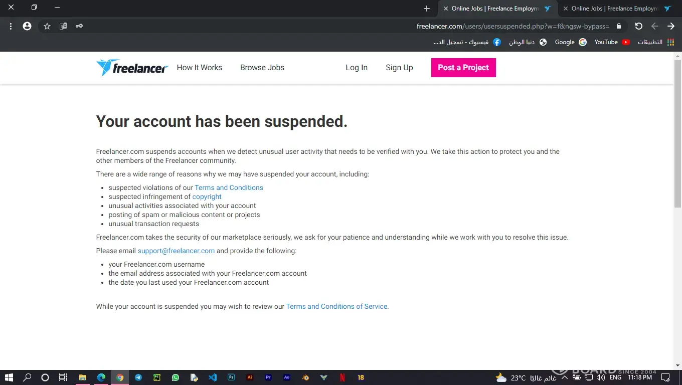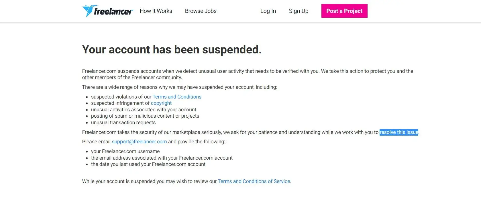 The freelancer company suspended my freelancer account on 16 July without sending me a suspension mail or any other notice.