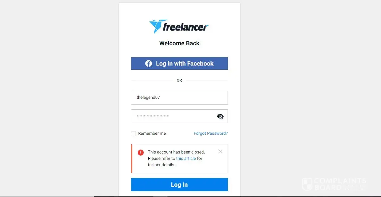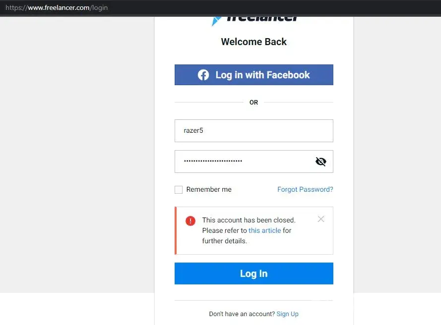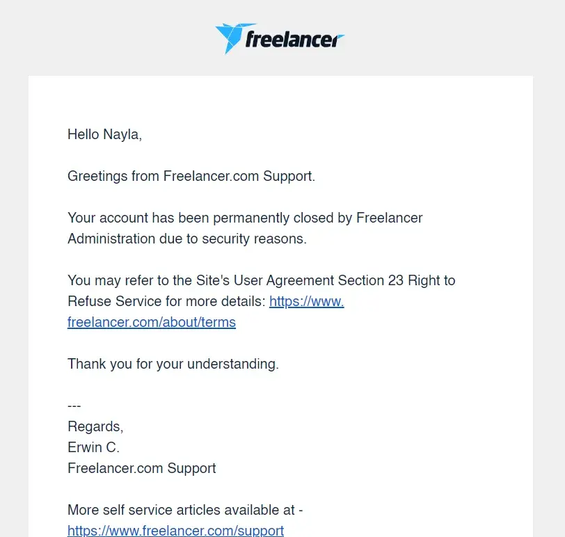You accepted our terms and conditions when you signed up as a user on the Freelancer website. It has come to our attention that you have participated in activities that may harm the business operation or reputation of Freelancer. We have closed your account for this reason.