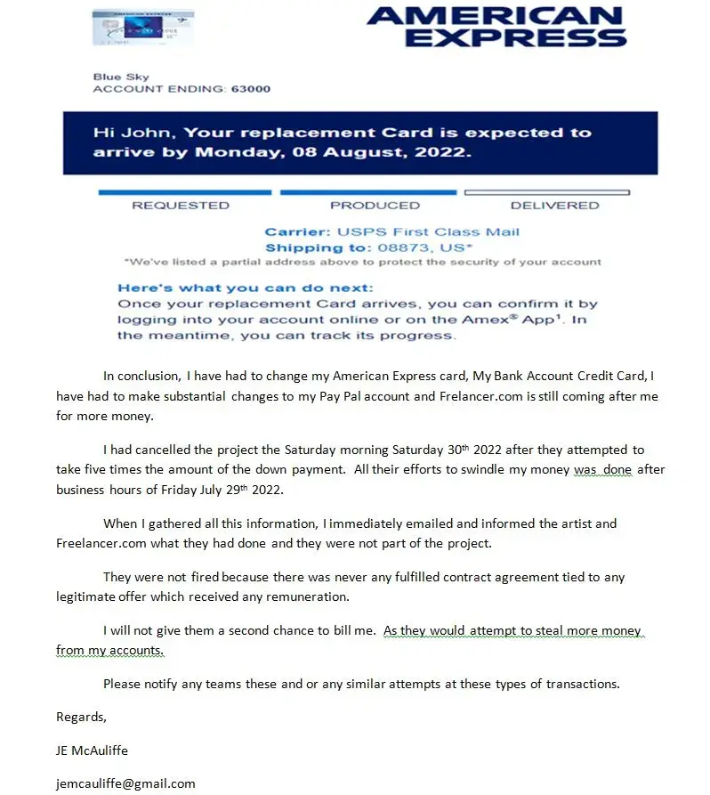 In conclusion, I have had to change my American Express card, My Bank Account Credit Card, I have had to make substantial changes to my Pay Pal account and Frelancer.com is still coming after me for more money.