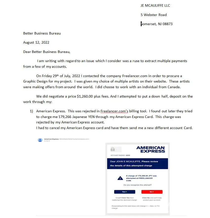 1) American Express. This was rejected in Freelancer.com’s billing tool. I found out later they tried to charge me 179,266 Japanese YEN through my American Express Card. This charge was rejected by my American Express account.