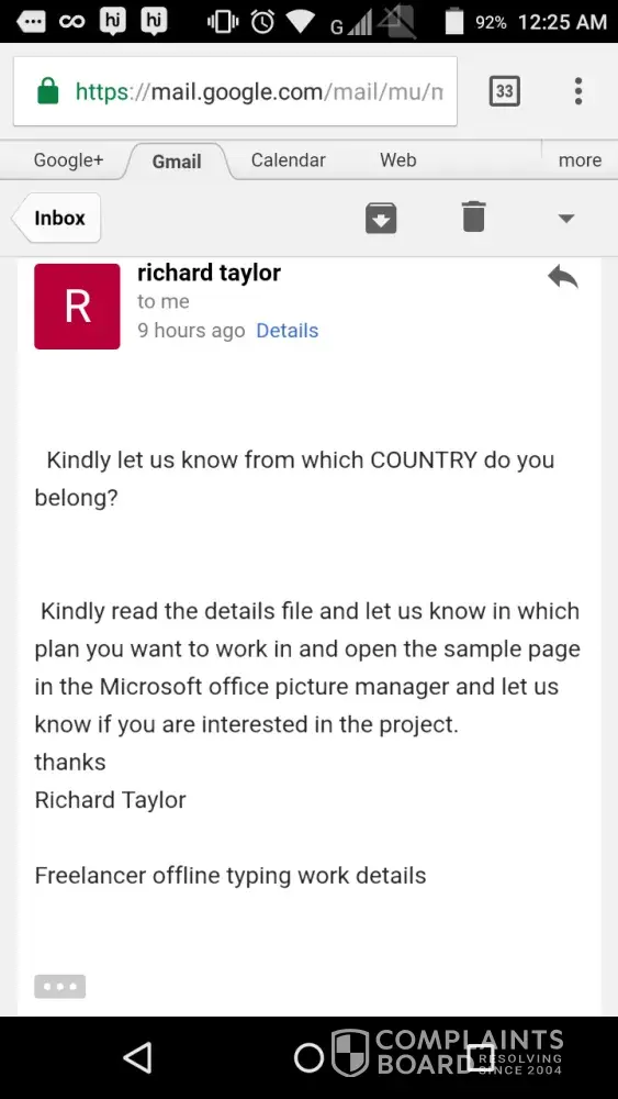 Same as it goes to me, plan p1, US$20 security deposit, 25 pages worth of data entry, exactly the same verbatim reason and the after one month the deposit will be refunded thing. Give the same website address. But this time around, he uses the name Richard Taylor with an email address: sunrisepublishers1@gmail.com