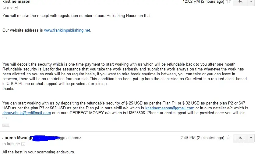Unfortunately I fell for this before finding these blogs. I paid $32 for a 50 page project, that was to pay $4 per page. Their pages were actually 2 1/2 to 3 page length in MS Word. I spent a great amount of time, including while I was sick, to complete the project. They stayed in contact with me up to assigning me the project. I turned in the work ahead of time, have emailed them 6 times and...NO RESPONSE! I was counting on this money to pay some bills and now am stuck with no way to pay them. They go under email ID franklinpublications6@gmail.com. Don't, I repeat DON'T let them do this to you. Now I face having my utilities shut off because I did work for a scammed. One question I have is the website does all this verifying identifications of the freelancers to make sure you are legit so why don't they do this for the ones posting the jobs? I made a poor decision in hoping to make some quick money to pay my utilities and now I'm out $32 security deposit and no way to pay my bills.