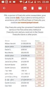 The Prize Team at PNI has already awarded over ninety-nine million in US dollars to hundreds of thousands of happy players in 41 countries; creating twenty-one $1, 000, 000.00 winners and four $10, 000, 000.00 winners. PNI, a sponsor of online sweepstakes, gives away awards of amounts up to ten million US dollars daily. If your name is on the list below, and you submit the winning entry in accordance with the Official Rules of FreeLotto, you could receive a call from our Prize Team letting you know that you are our newest jackpot winner.