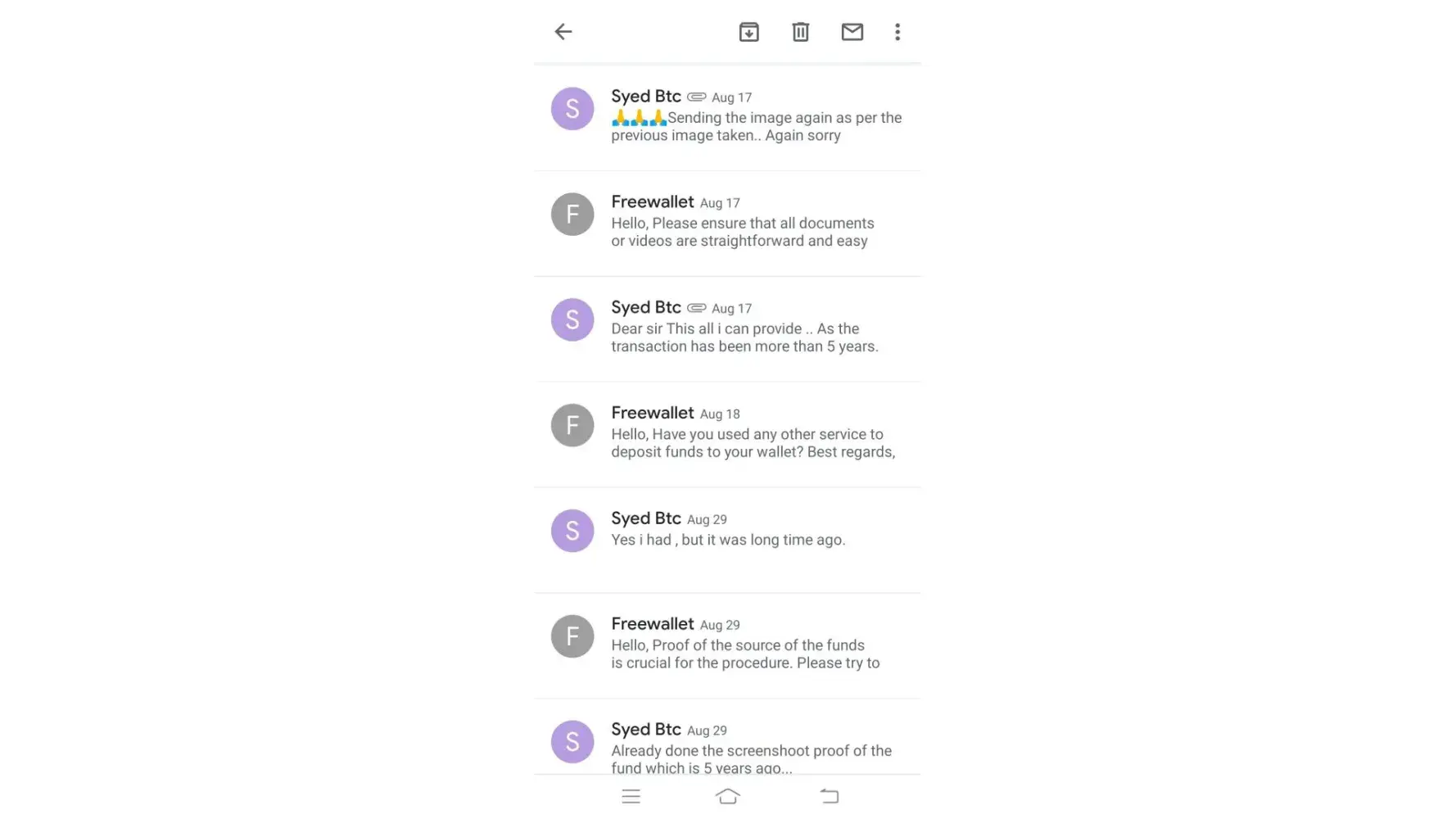82 emails with selfie photos, documents, invoices, all transactions! Even the video of the proof of transactions has been sent to you. And the only answer that your support team repeats to me can be seen in the screenshot