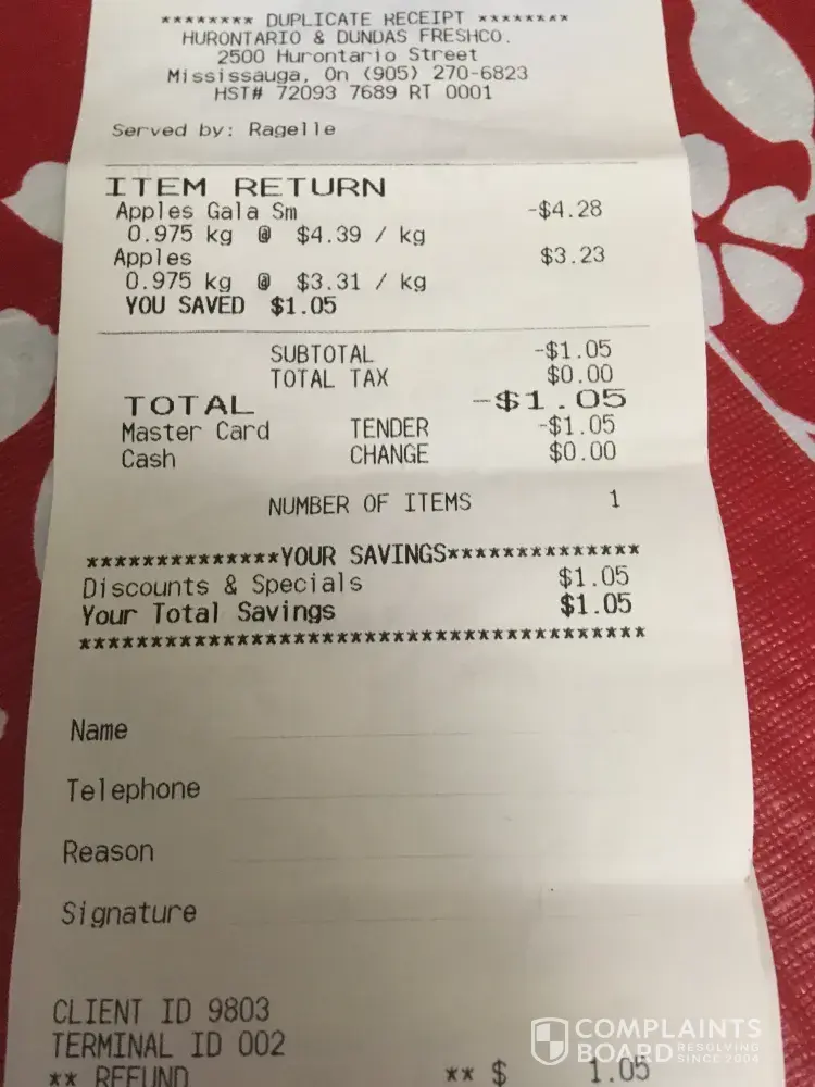 Date of Incident - 28th July 2019 Client Number - 9803 Description of Incident I bought Red delicious applies from the store and the cashier charged for Royal Gala apples. When I checked the receipt then I found that I am overcharged. I brought that to her notice then she said that she has done a mistake and she will refund the extra amount. I said to her...