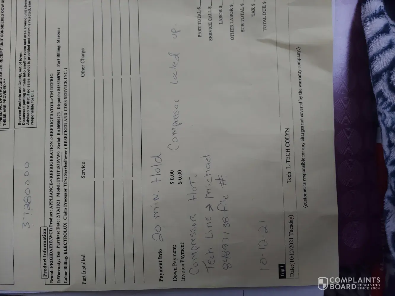 Bough in 10-21-2020 door had a dent in it shelving was broken 2bins Ice maker never worked they been out here ten times to fix it And e ordered the wrong door it came in and it had a big scratch on it also all my food is freezing had to throw it away took pictures of it Took off work for 4 confirmed appointments and then they never showed A-and E