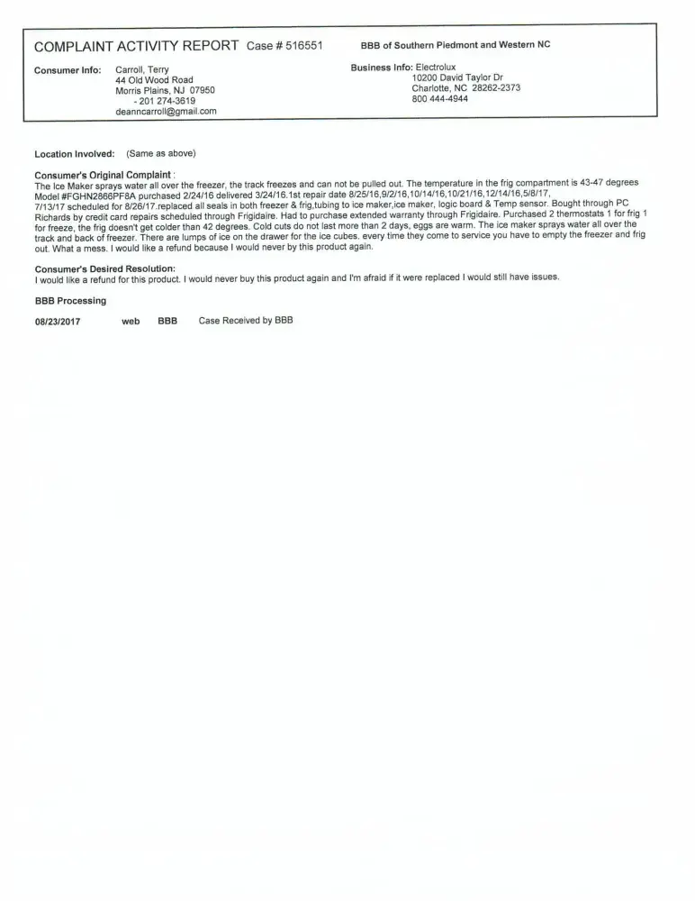 On February 13, 2016 I purchased a Frigidaire Refrigerator, Model #FGHN2866PF8A Serial # 4A54417303, and took delivery on March 24, 2016. Attached are the service records for this product, the problem to date has not been rectified. I made all my service calls through Frigidaire's customer service line instead of the dealer we purchased it from thinking I was doing the right thing, however when I reached out to the dealer they said they could not help because I didn't purchase the extended warrantee through them, I purchased it through Frigidaire. In my opinion I shouldn't have had to purchase an extended warrantee because the problem was ongoing from the installation of the product. The ice maker spews water all over the back of the freezer making it almost impossible to pull the upper rack out. There's a lump of ice on the ice bucket and in the bucket itself. The refrigerator run at least 10 to 15 degrees higher than the setting of 33, so I can not keep cold cuts or milk. There are no parts left to replace, the main seal from the freezer to the frig has been replaced the ice makers tubing, the ice maker, the seal on the ice maker, the main logic board and the temperature sensor. The last repair person that was here just through up his arms and said he couldn't do anything for us. I filed a complaint with the Better Business Bureau and have contacted my credit card company to see if I can get a refund. It's odious Frigidaire does not stand behind their product. I'd like a refund on this product afraid if it is replaced I would only have the same issues.