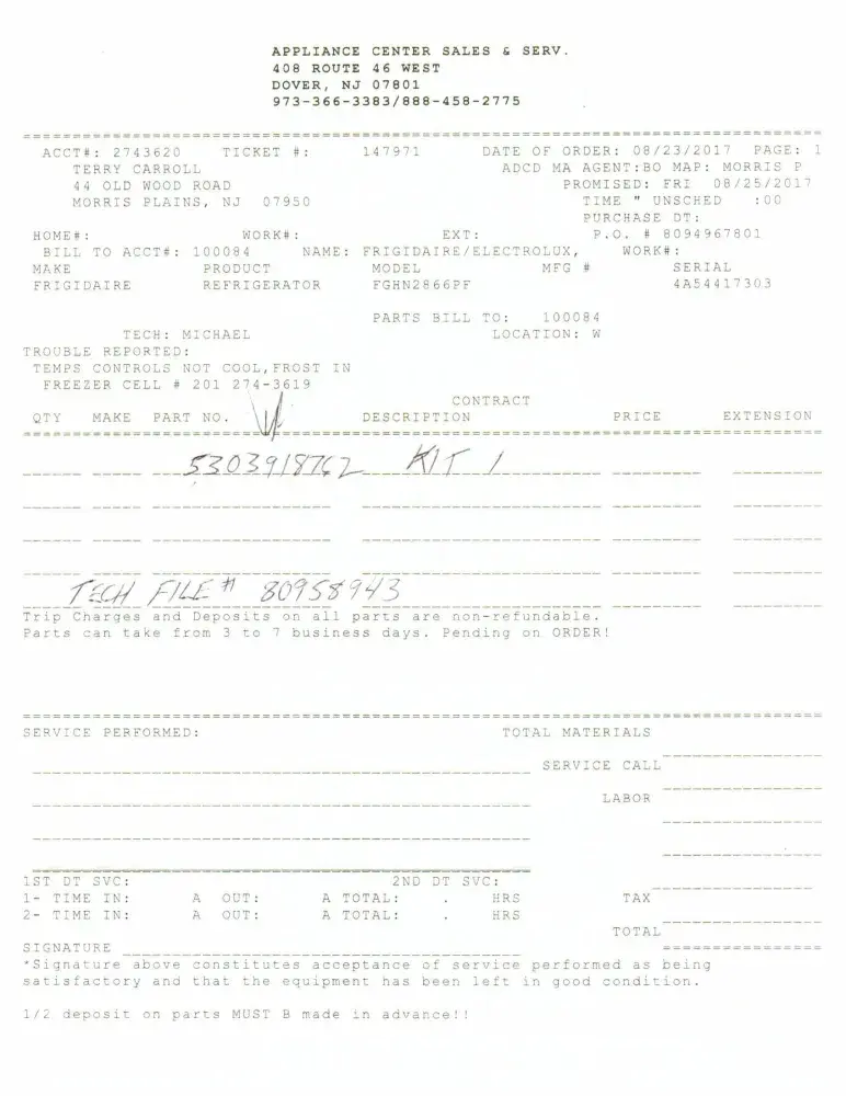 On Tuesday, 10/17/17, the Frigidaire representative then set up an appointment for today [Saturday 10/21/17]between 8AM and noon for Central Air & Appliance [979.218.1258] to come and diagnosis the problem. Frigidaire set it up on Saturday so I would not need to miss any more work. This means, A MONTH LATER after my first call to Frigidaire for an icemaker that is not working in a brand new refrigerator, I am starting the process all over again. I cancelled errands I needed to run to stay home for this repair service. At this point, I have lost almost 3 days in phone calls to Frigidaire and time off from work.