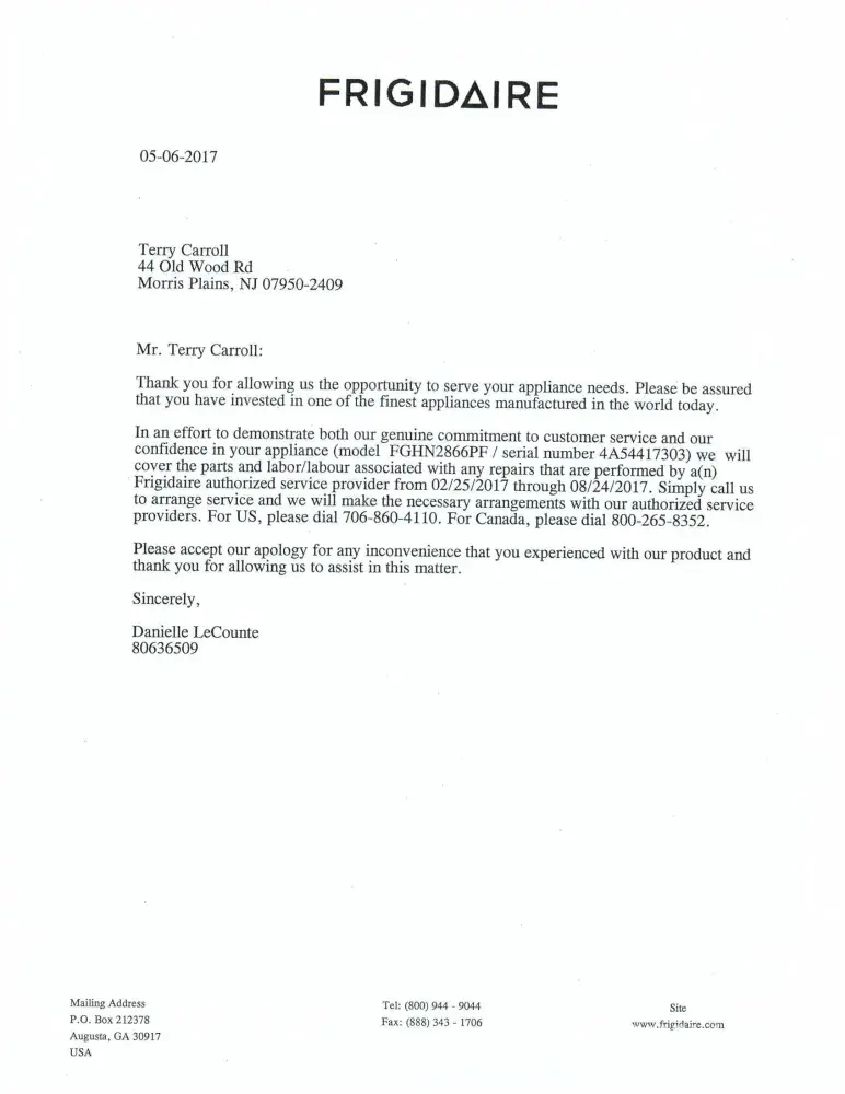 This is totally unacceptable. I will never purchase another Frigidaire appliance and am telling everyone I know about this horrible "customer service" experience.