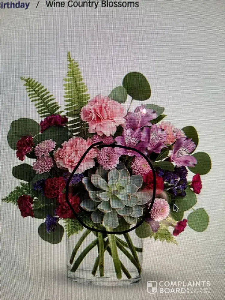 The problem was it was not what I expected it would look like from the picture on your website. There was not a succulent in the flower arrangement and it looked only a bit like the picture.