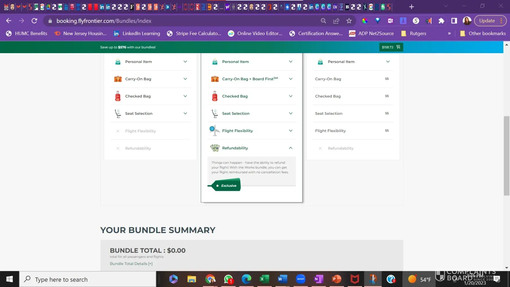 Flight Confirmation FE6ZJQ; Flight number F9-2158 Departing Las Vegas on 20 Jan 2023, at 0015 to Miami.