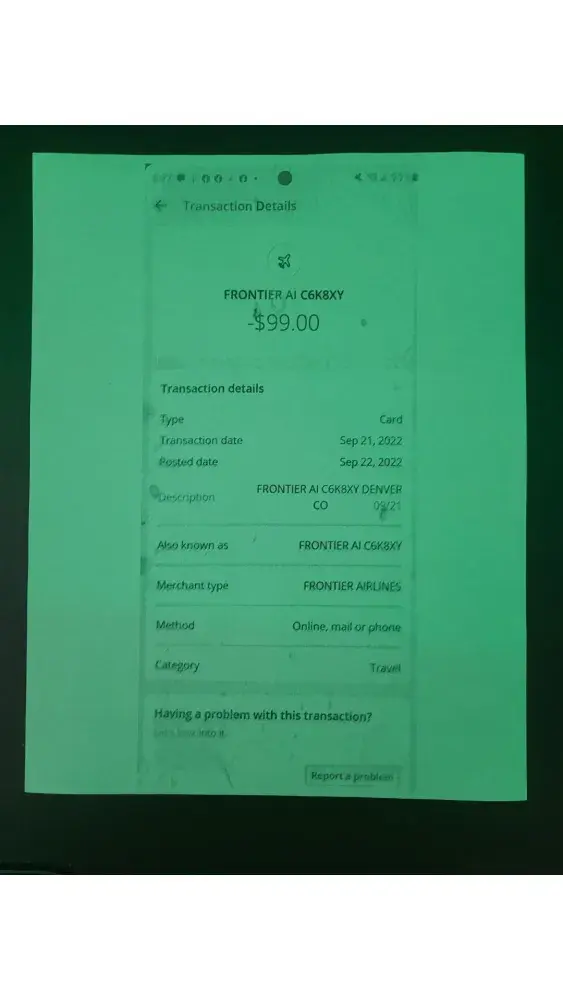 On September 21, 2022, in connection with my travel on Frontier Airlines en route from Trenton Airport, (Trenton NJ) to Atlanta International Airport, (Atlanta, GA), as I was about to board the plane, I was advised by a Frontier Airlines Agent that I had to pay a carry-on baggage fee of $99 because my personal item exceeded the size restrictions. I provided the Frontier Airlines Agent a bank debit card for the charge of $99 and it was approved and debited. I later discovered on or about September 26, 2022 that Frontier Airlines had charged $99 to my Frontier Airlines Mastercard. Immediately I contacted Frontier Airlines Mastercard (Barclays) to refute the charge based upon fraud and I closed the credit account. On October 5, 2022, Barclays issued a letter indicating that its fraud investigation was completed and that I was not responsible for the reported fraudulent activity.