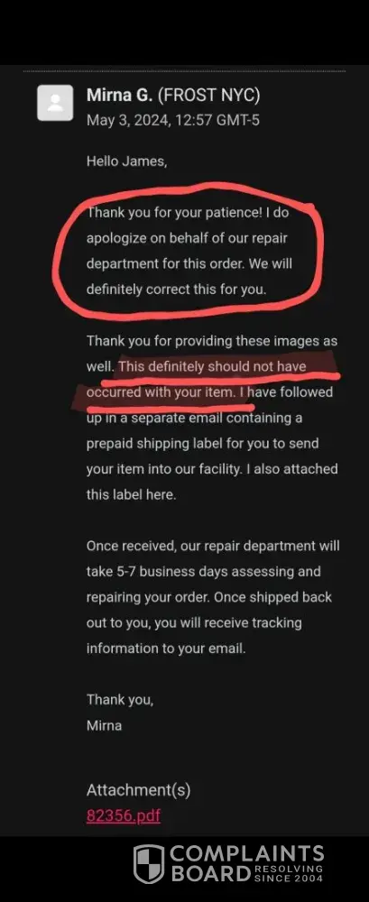 I sent my chain in to be repaired on 4.14.24. Frost ruined it & sent it back to me destroyed! Mirna apologized & sends me a return label to get it fixed