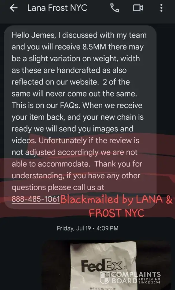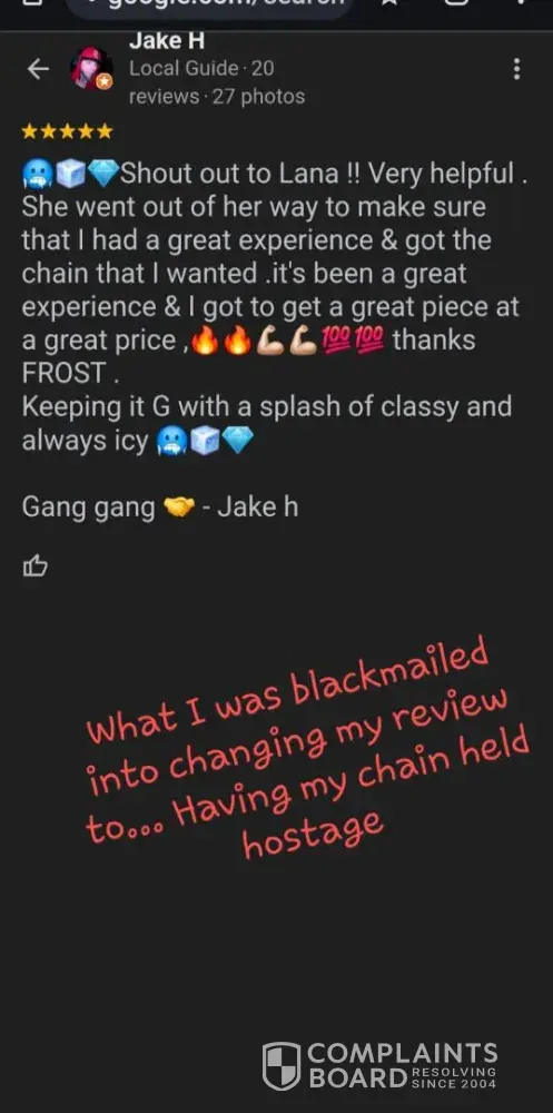 Once Frost got it back, they say they won’t start making my new chain until I update my review & that its store policy. BLATANTLY HOLDING MY CHAIN HOSTAGE UNTIL I CHANGE MY REVIEW! Since when did reviews become more important then customers getting what they PAID for & are promised? & what company has a policy where its ok to BLACKMAIL customers by holding their property hostage in exchange for updated reviews?