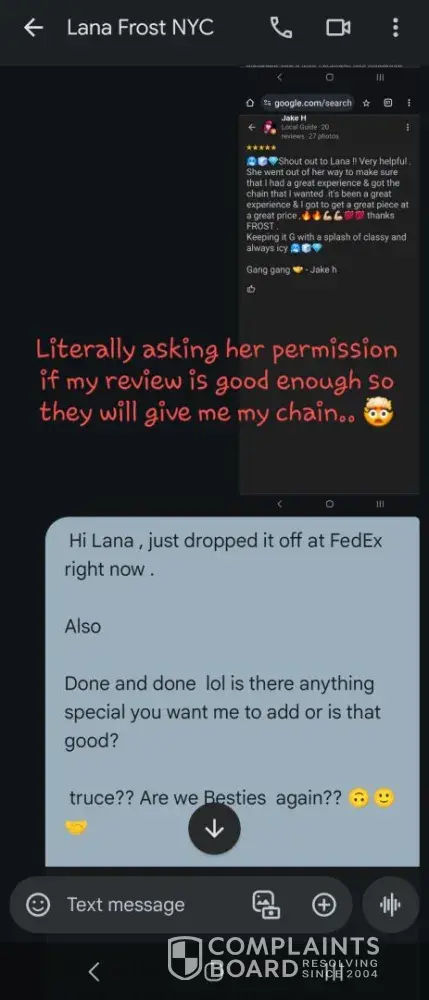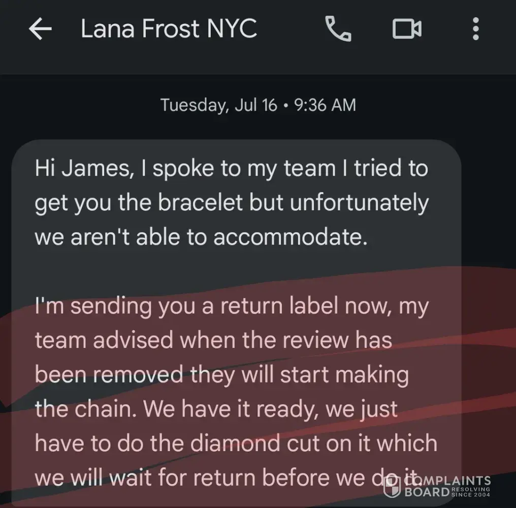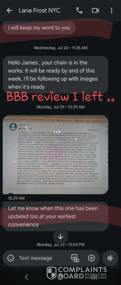 After I leave a negative review, Lana w/ Frost Mgt quickly reachs out to me. She apologizes for everything & says to send the chain back & they will “MAKE ME A BRAND NEW CUSTOM CHAINâ€. She promises to send me pics & a video to get my approval before shipping it. I agreed & send the chain back for the 4th time