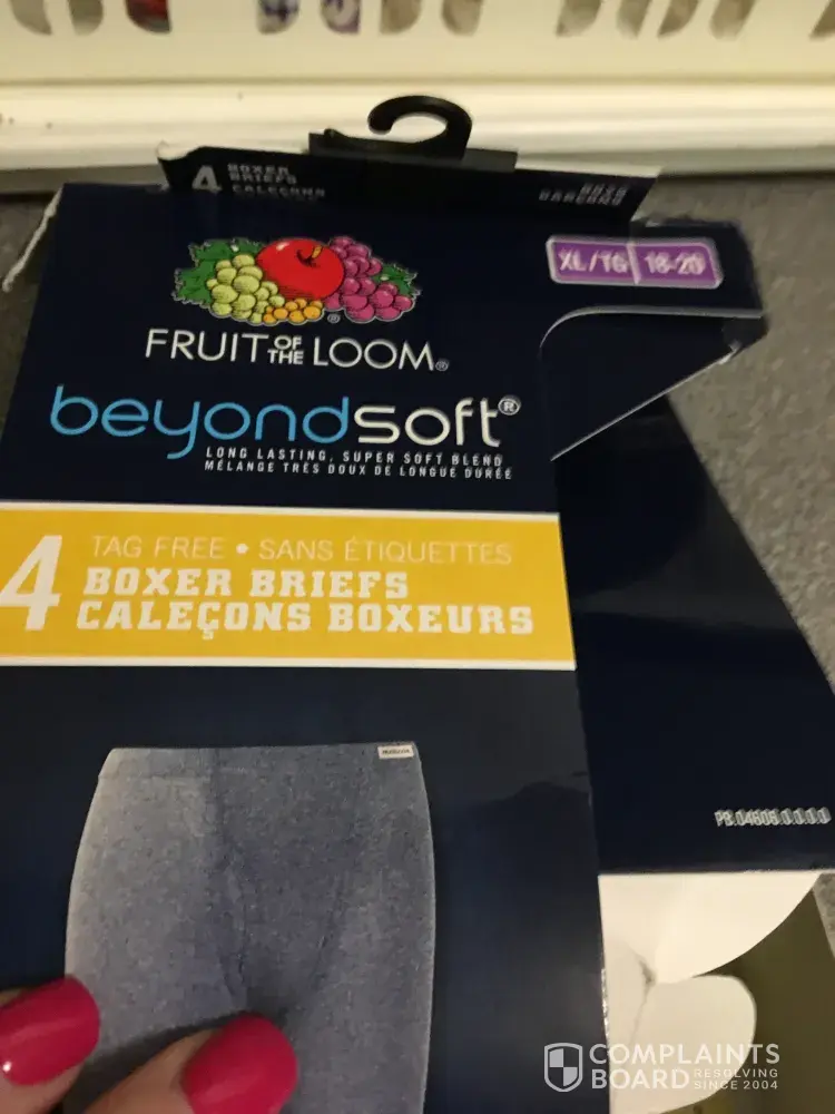 I made two trips to Walmart today to by these boxers. First Time today I had to return them cause the size on the box was xl-18-20. When I pulled them out to wash them they were 12 to 16, big difference in size took them back and they would only allow me to exchange. Was not happy that I had to drive back there to begin with. So I get home with the XL 18 to 20 wash them to find that they fell apart. At this point Walmart will not exchange or credit me. So I am writing you at this point full of frustration and angry at the fact a top brand product as turned out to be a headache from the get go.