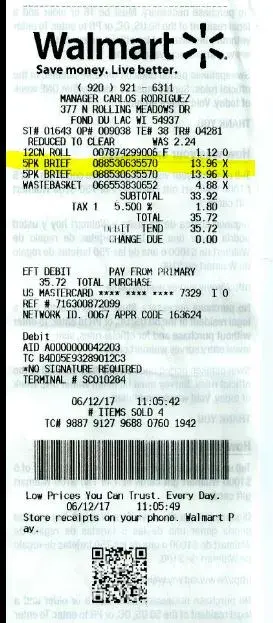 I purchased two five pack men's boxer briefs from local Walmart Store on 6/12/2017. The seam between the leg openings on a couple of the briefs have opened on some of the briefs after only 6 machine washings. The briefs are medium in size and fit my 164 pound body comfortably. I am requesting a refund of $14.73 (13.96 cost of one of the five packs plus Wisconsin Sales Tax (5.5%) of 0.77). I have attached the purchase receipt as well as a picture of one of the briefs with showing the seam opening.
