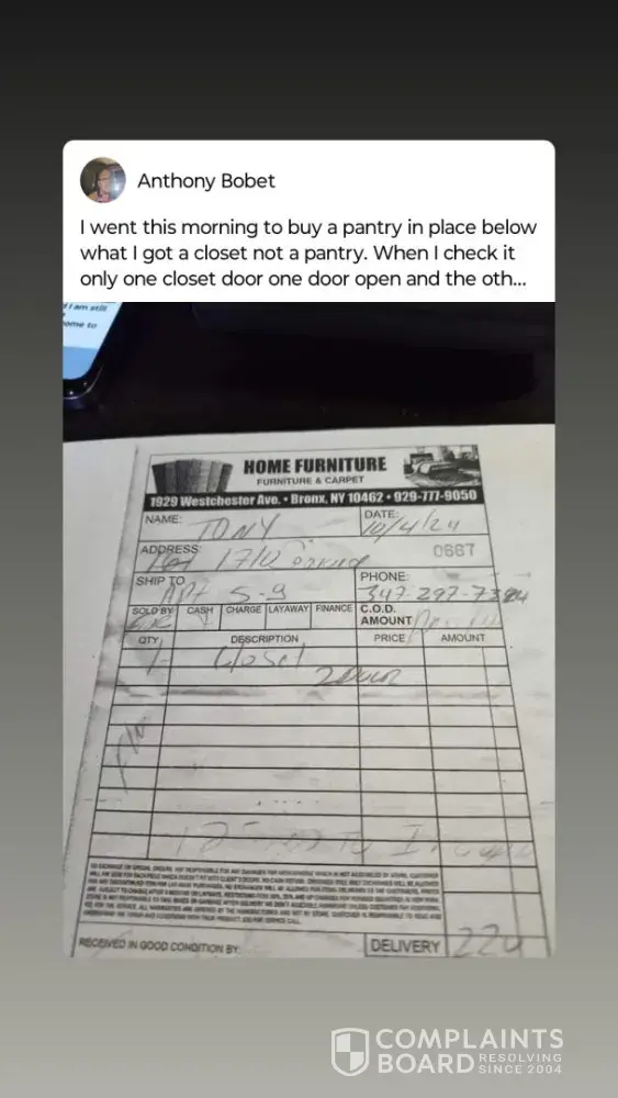 Hello, My name is Tony Bobet I reside at 1710 Seward Avenue, apartment 5g, Bronx, New York City 10473. I am file an complaint to Home Furniture: Furniture and Carpet the location is 1929 Westchester Avenue, Bronx, New York City 10462. On Friday, October 4, 2024, I went to buy a pantry. When I finish with the buying the item I text my brother that I have...