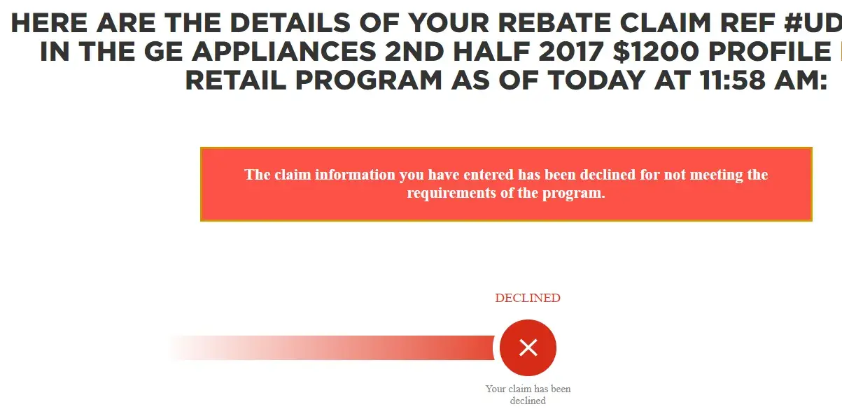 Its been 6 weeks and so I checked on my GE rebate today and it shows declined. This is ridiculous as I completed every answer that was needed for submission within the timeframe alloted and now they are trying to skate by without paying up. The rebate was a big reason why I went with GE over other brand. What can be done about it at this point?