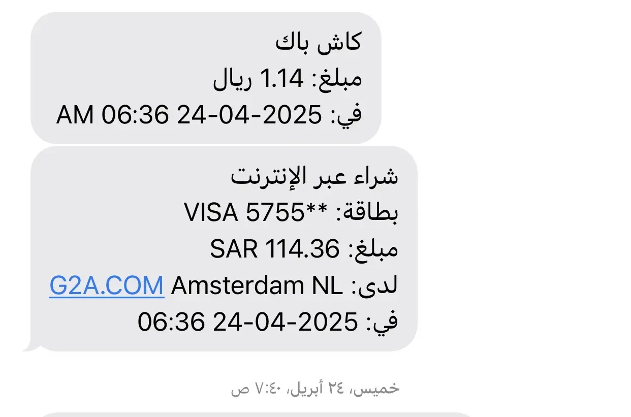I purchased a PayPal top-up code from G2A.com on April 24, 2025, for SAR 114.36 using my Visa card ending in 5755.