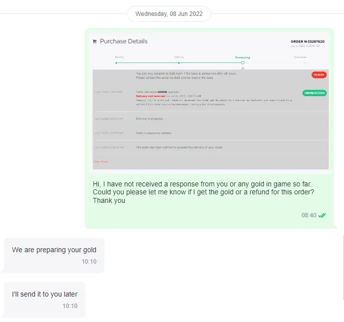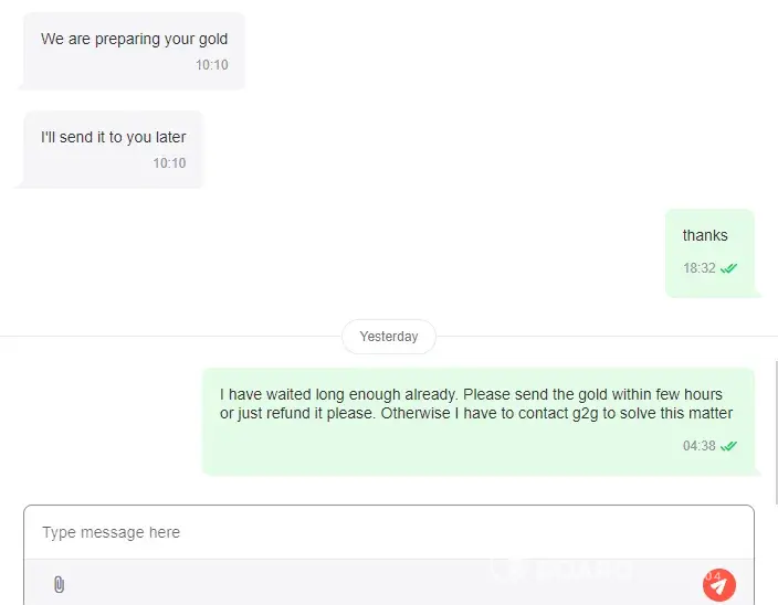 I have ordered some currencies in G2G on the 7th of June 2022. The sellers only delivered 2 out of 3 orders within 24 hours and 1 order never arrived. I tried to contact the seller in the first place and they kept on ignoring my message or telling me that they will deliver the oder. I have warned them that if they don't deliver it, I would have to report it to G2G but despite the warning, the seller never delivered my order. Until the 10th of June, I have enough of it and reported the incomplete order to G2G to have a look at the issue. However, after 3 days, the order was marked as solved / complete (without any reply from G2G or any notifications) even though I have not received any currency I have ordered nor did I get any refund (as I requested in the complaint). I sent a ticket after realizing it but after 3 days, even though it was passed on many employees, no one even bothers to send any replies or updates on my issue. That's why I have decided to reach out to this complaint platform!
