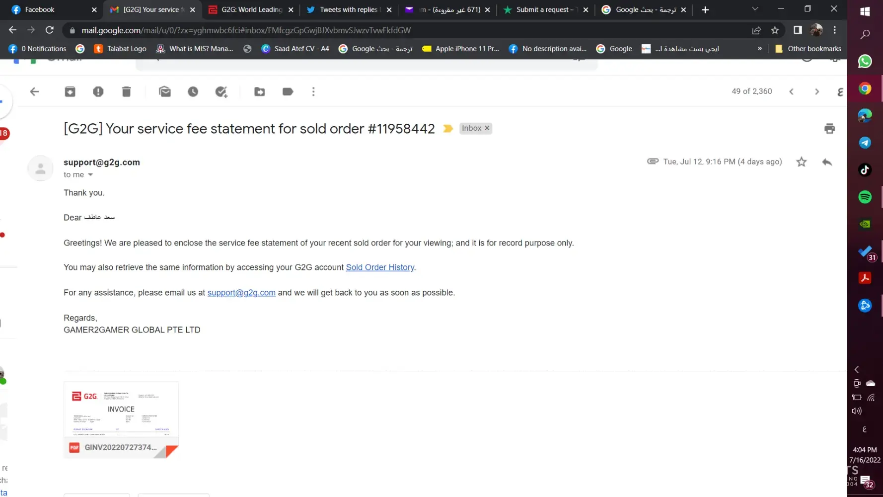 Saturday 11:59 pm: Thank you for shopping at G2G Marketplace. Attached is the invoice of your recent purchase; and it is for record purpose only.