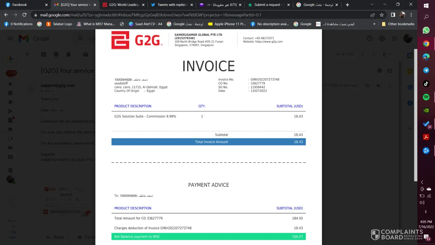 I want to solve the problem as soon as possible, and here is the bill. I have not performed operations outside g2g