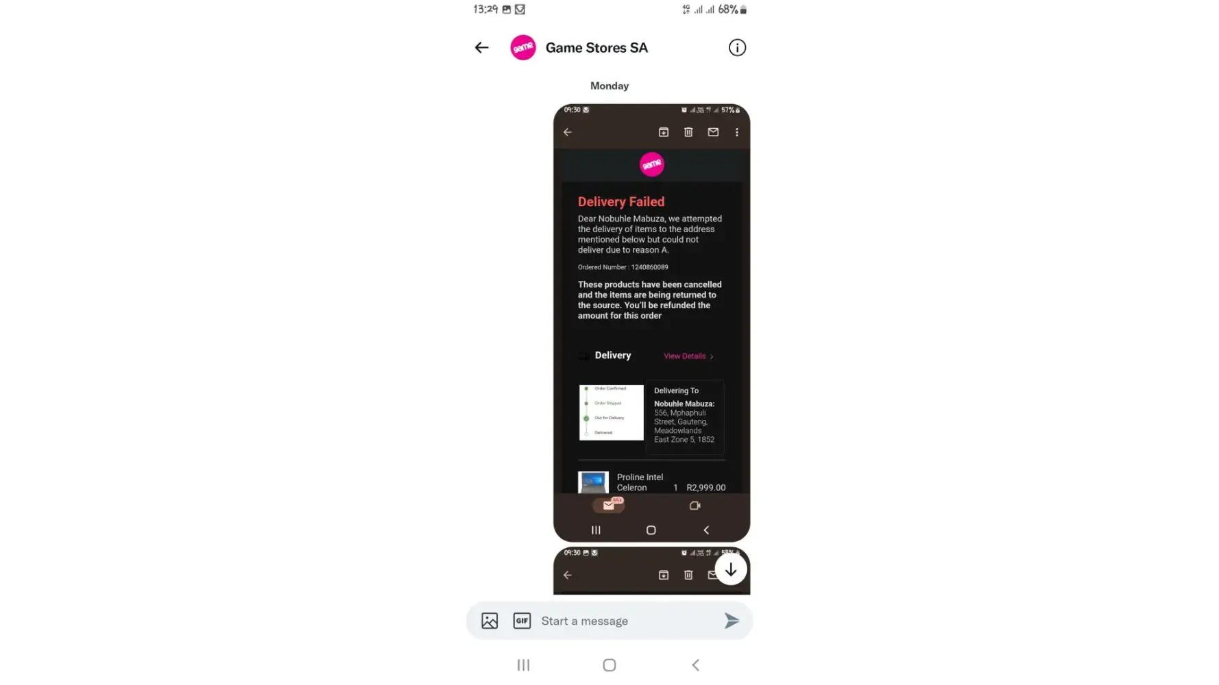 I bought a treadmill at Game Canal Walk on Sunday 27 November and was promised that it would be delivered yesterday 29 November. On Monday i received this message.