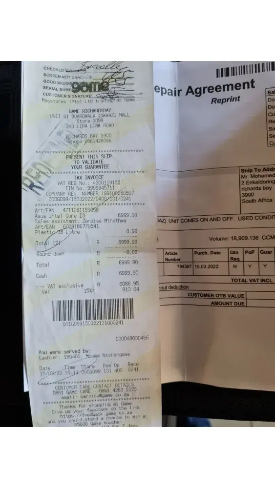 I bought a brand new Asus Intel Core I3 Laptop from Game Richards Bay on 15.03.2022 for R6999.