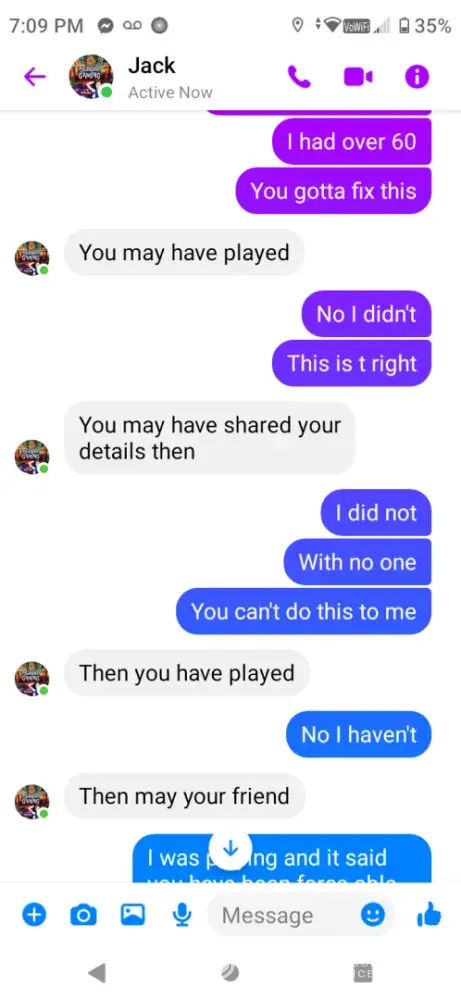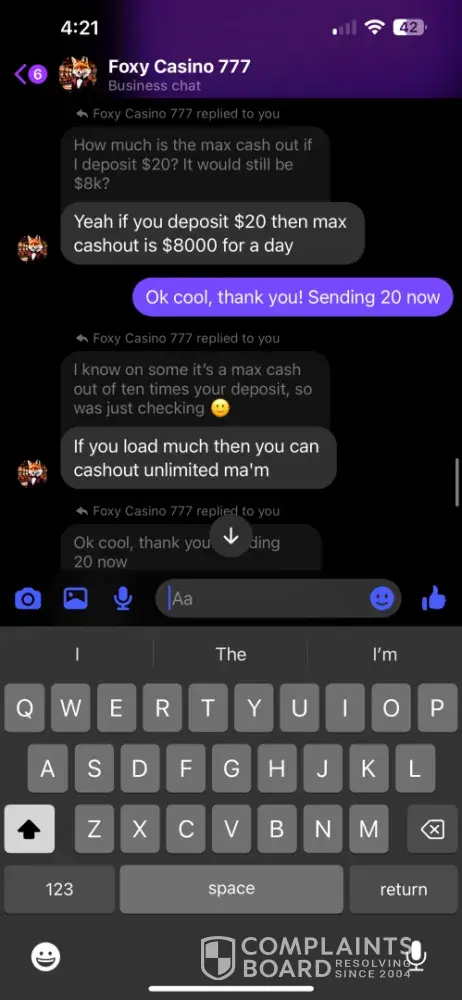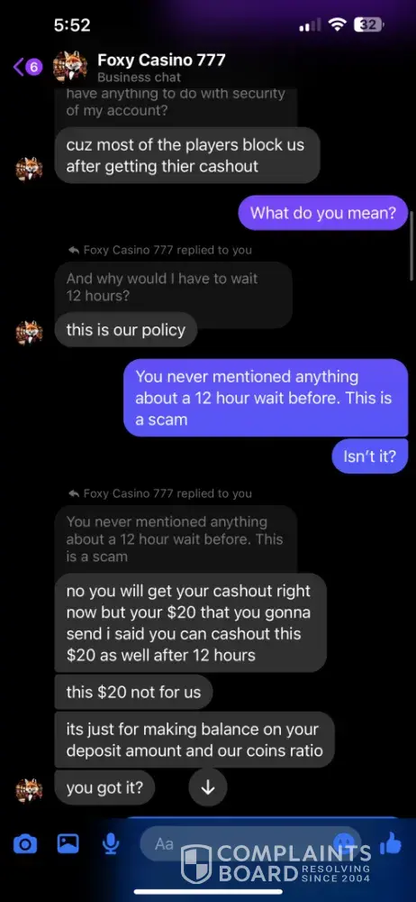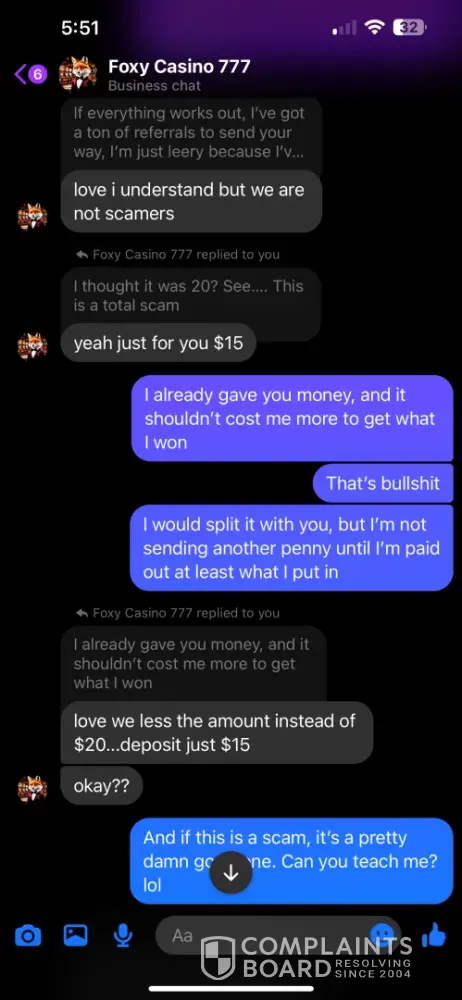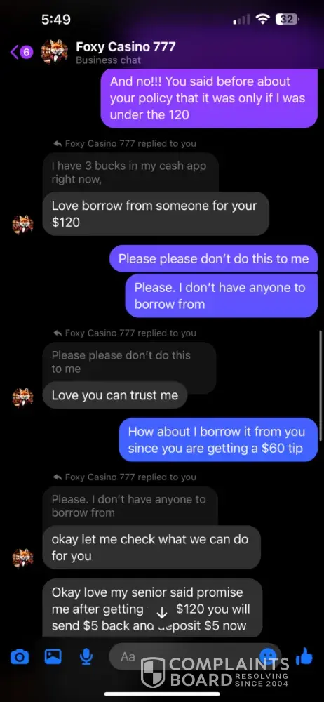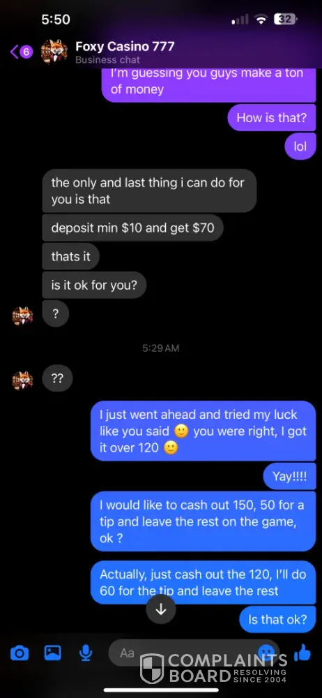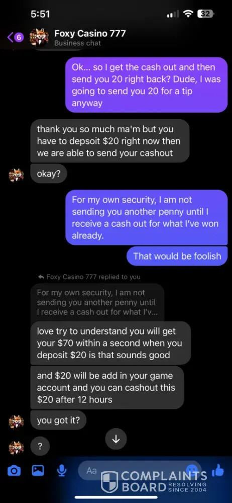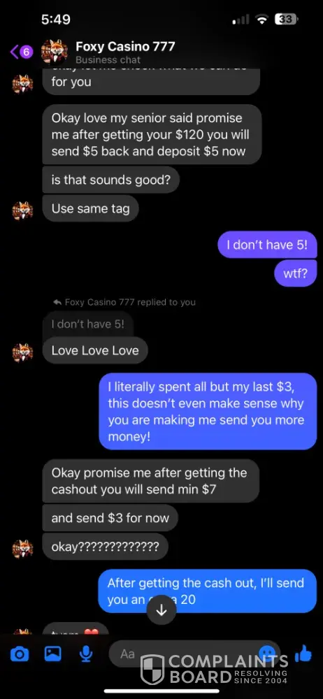 I signed up under Foxy Casino 777 through a Facebook post. I specifically asked for the minimum/maximum cash out amounts and was told 60 minimum/$8k max. I asked for a $20 deposit if it would have the same cash out, but didn’t think to ask about the minimum. So I was at $70 and tried to cash out. I was told the minimum was 120, but if I sent another 20, I could have the 70 and would be able to cash out the 20 within 12 hours. I told them I didn’t understand why I should have to make another deposit, so I tried my luck at reaching the 120 and did. I got it up to $250, which is well over the 120 minimum, I told them I wanted to cash out 120, would do a $60 tip and wished to leave the rest on the game. I was then told again that another deposit was required to receive my cash out. We went back and forth until he agreed to accept the last $3 I had in my cash app, but had to promise to send another $7 when I received the cash out. So I sent it, and still have received nothing. I was told that they were not a platform, but a “family†and that they are not scammers….