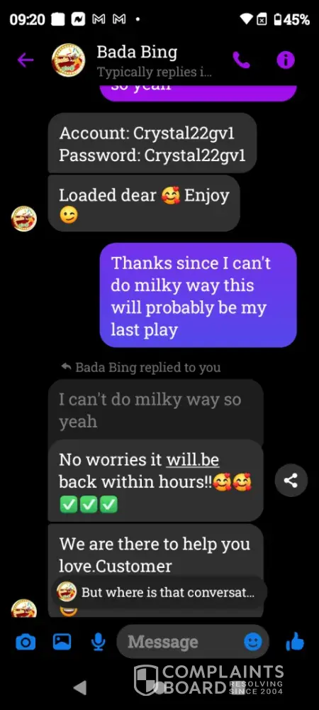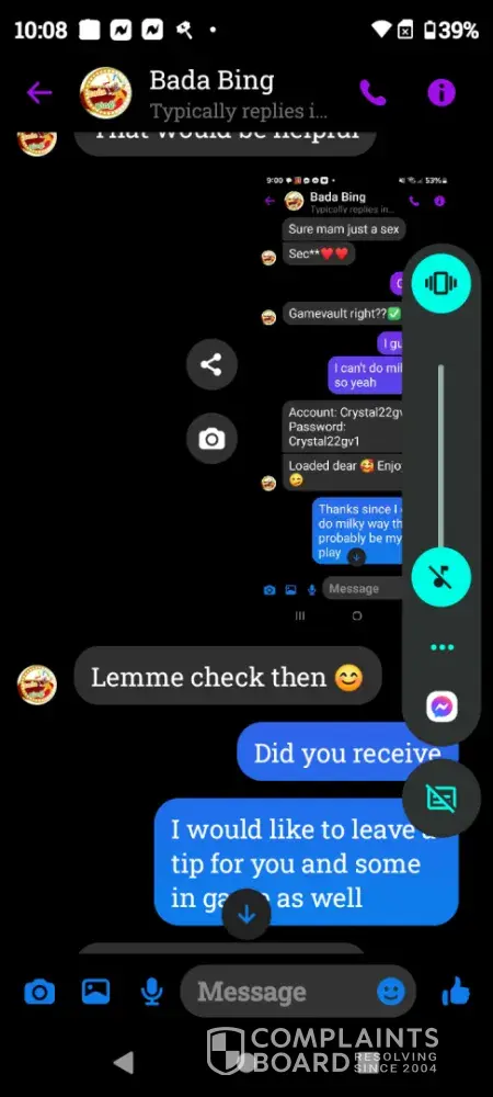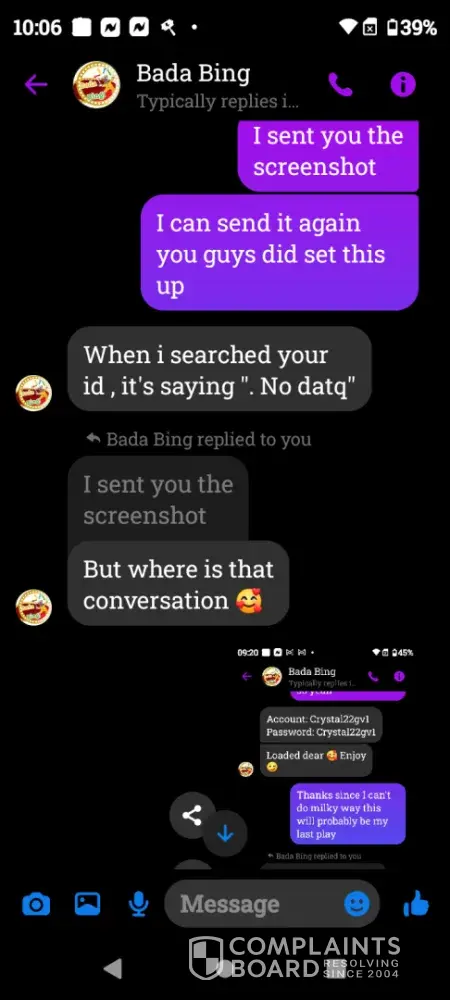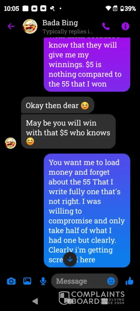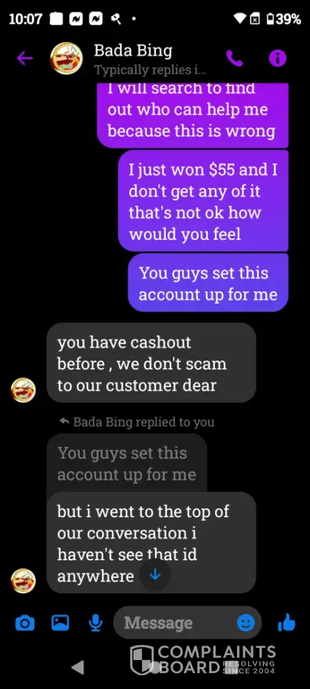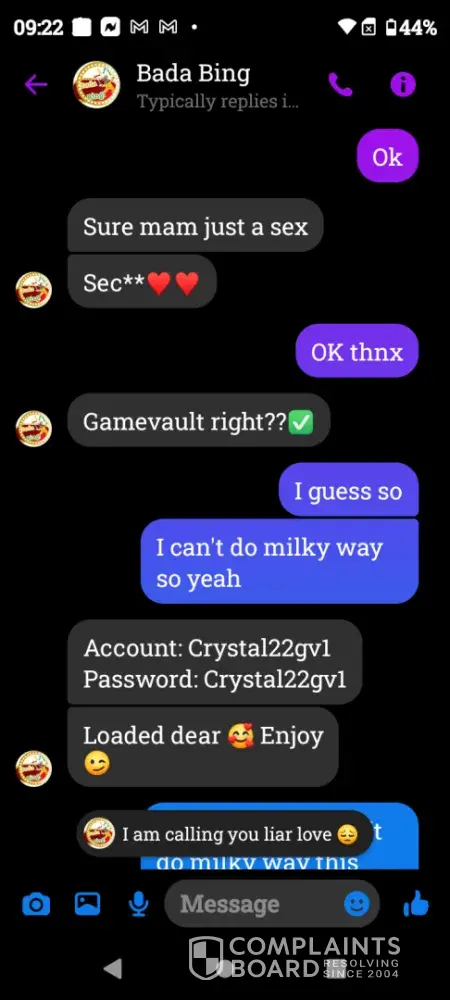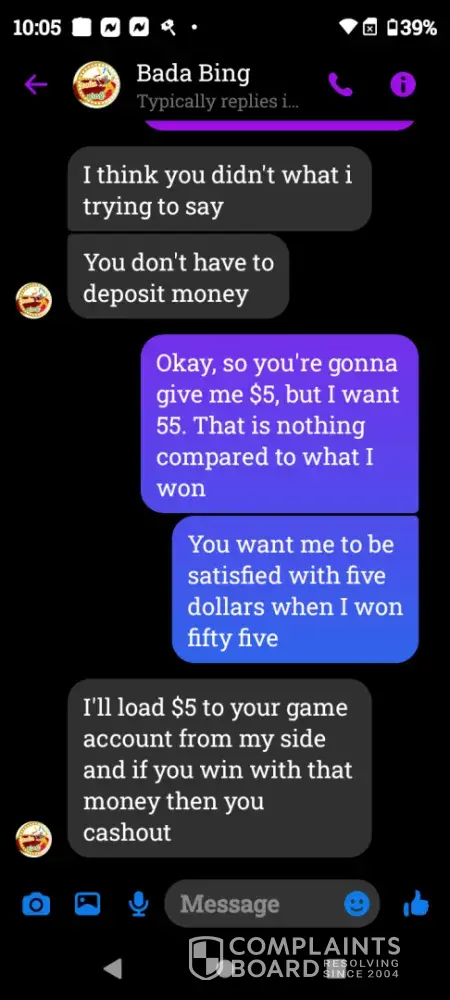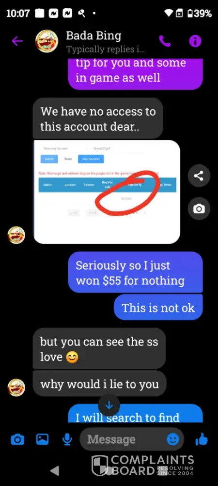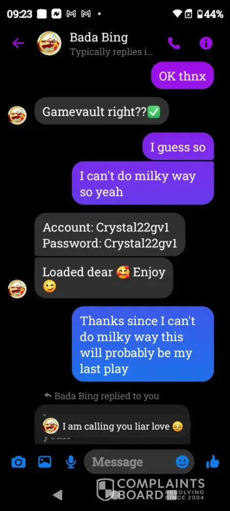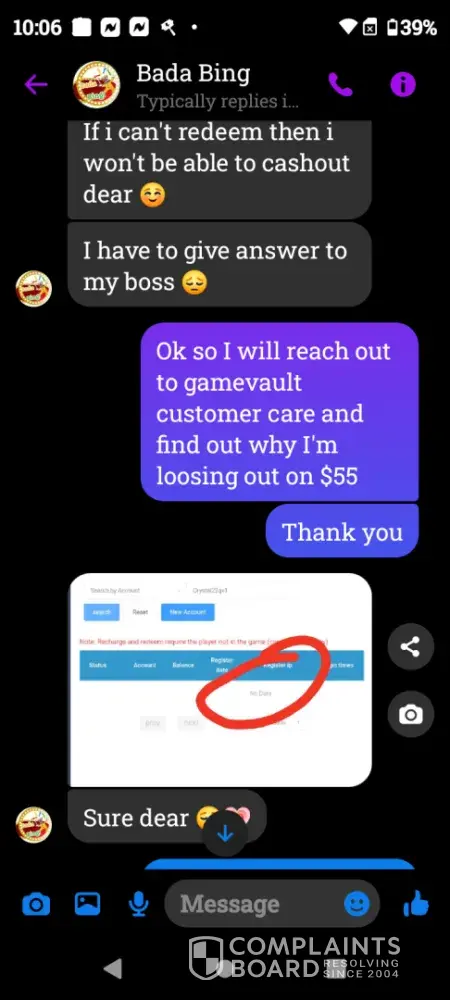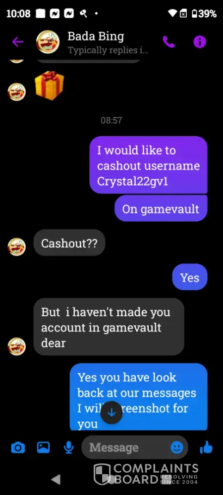 On Wednesday February 21st a gamevault account was set up for me using Bada Bing my username Crystal22gv1. Today Saturday February 24th I played and won $55 I sent my platform information letting them know I was ready to cashout and the informed me they did not set up that account for me however I screen shot our previous correspondence and sent it to them yet they continued to deny setting up my account. Later in conversation they offered to load $5 for my inconvenience which I declined. Because there was no resolution in this matter I chose to reach out to you guys. I have screenshots of all of our correspondence as well as a screenshot of my winnings if you need it. I thank you in advance for you attention to this matter and look forward to working with you in an effort to resolve this matter.