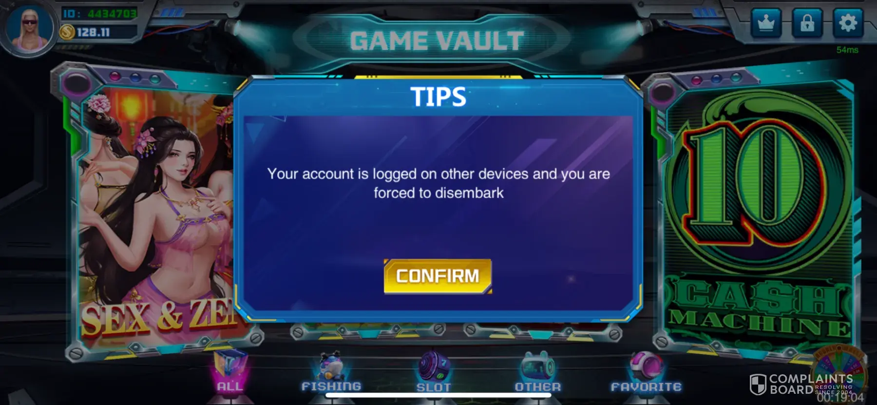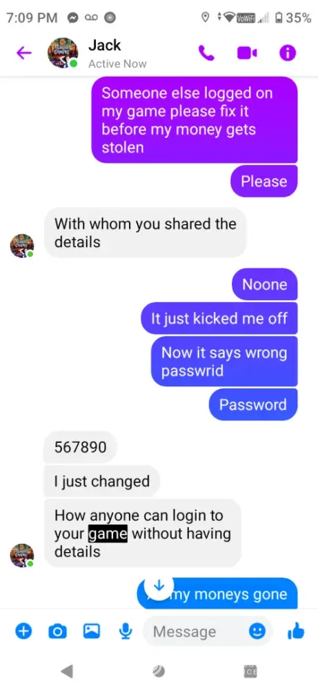 I was playing wheel of fortune on game vault I was at $68.50 someone logged on kicking me off I reported it to game host my password was reset and my balance was gone game host said it's all played it but the game log showed a game ive never played must have been friend noone had my password I have screenshots of all messages I know it was the game host please fix this