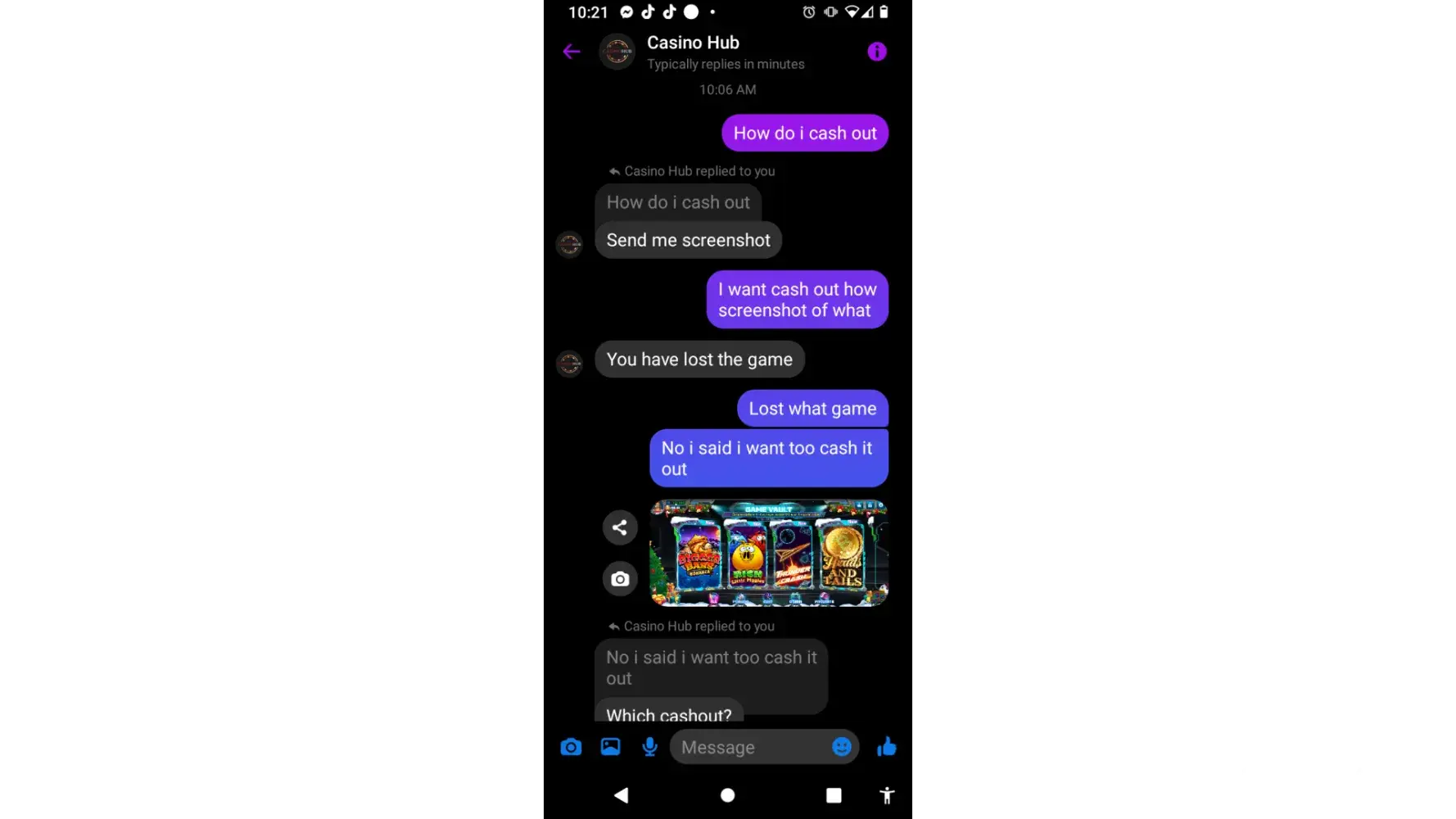 I had uploaded $10 dollars to one of the Facebook gaming platforms. Tje facebook page is called Para Casino 777 and they support game vault. I won $112 and some change. The platform is now refusing to cash out my winnings and has blocked me from communicating with them. I just want to make people aware of this matter so it does not happen to other people who put the trust in this Facebook platforms. This business has refused to give me the money I have won and will not refund my money back I put into the game. I have screenshot of the messages between this business as well and a picture of my winning in the game. I am having trouble uploading them in this report, but if you would like I can email them once I get a respond. Please help me. I don't know what to do in this type of matter. I am a single mother and I just want people aware of what is happening