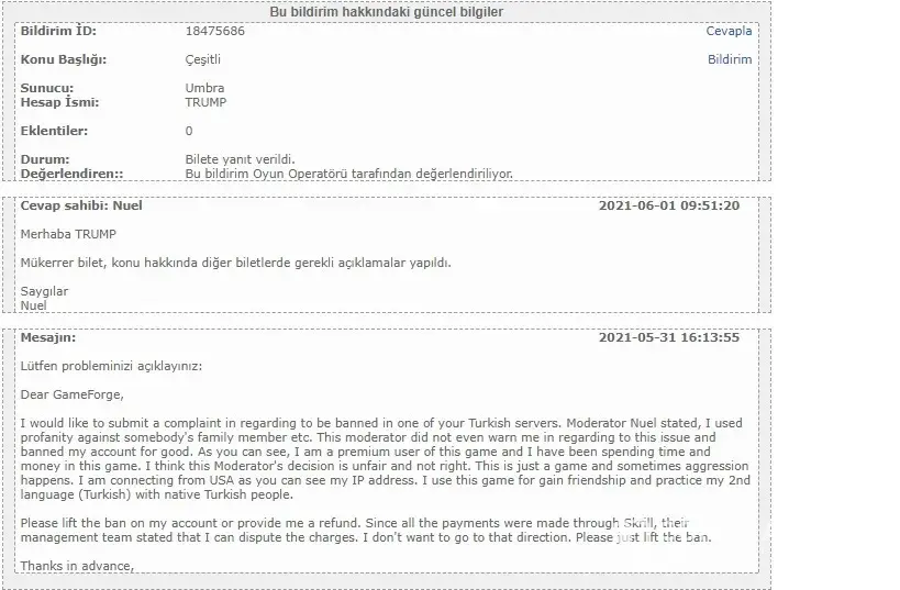 I opened ticket number [protected] and [protected]. at https://support.gameforge.com because they banned my game accounts without any proof against me accusing me of buying yang with real money. i didn't buy any yang with real money, the only real money i gave was on MD coins in game on their site. I have not violated any terms and conditions. I invested time and money in this game and they permanently blocked my account, they didn't even give me a warning, they didn't want to contradict themselves in their statements, they accused me, they slandered me, they said that I bought something earned by someone with software, I don't know anything, I borrowed from thatperson not even with real money and knowing how that person produces winnings in the game. then they restricted my access to my https://support.gameforge.com account, they don't let me create tickets anymore, they removed the send reply and complain buttons from my niq email address.[protected]@yahoo.com and also sura.[protected]@yahoo.com .i want my account back these game operators are doing whatever they want in the game i think i am god they are mocking the players this is not possible. please help me recover my account, I will leave my data here: