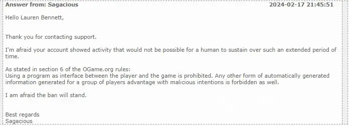 Hello, i have been playing the game OGAME, since about 7 months ago, i allways participated in the game with money. I have played on the server Undae with last name '' Captain America'' and server Wurren with the last name as ''Lauren Bennett'' my experience so far was great, i abught some dark matter and i had a lot of fun, until this GO '' Sagacious '' banned me for no reason other than this :