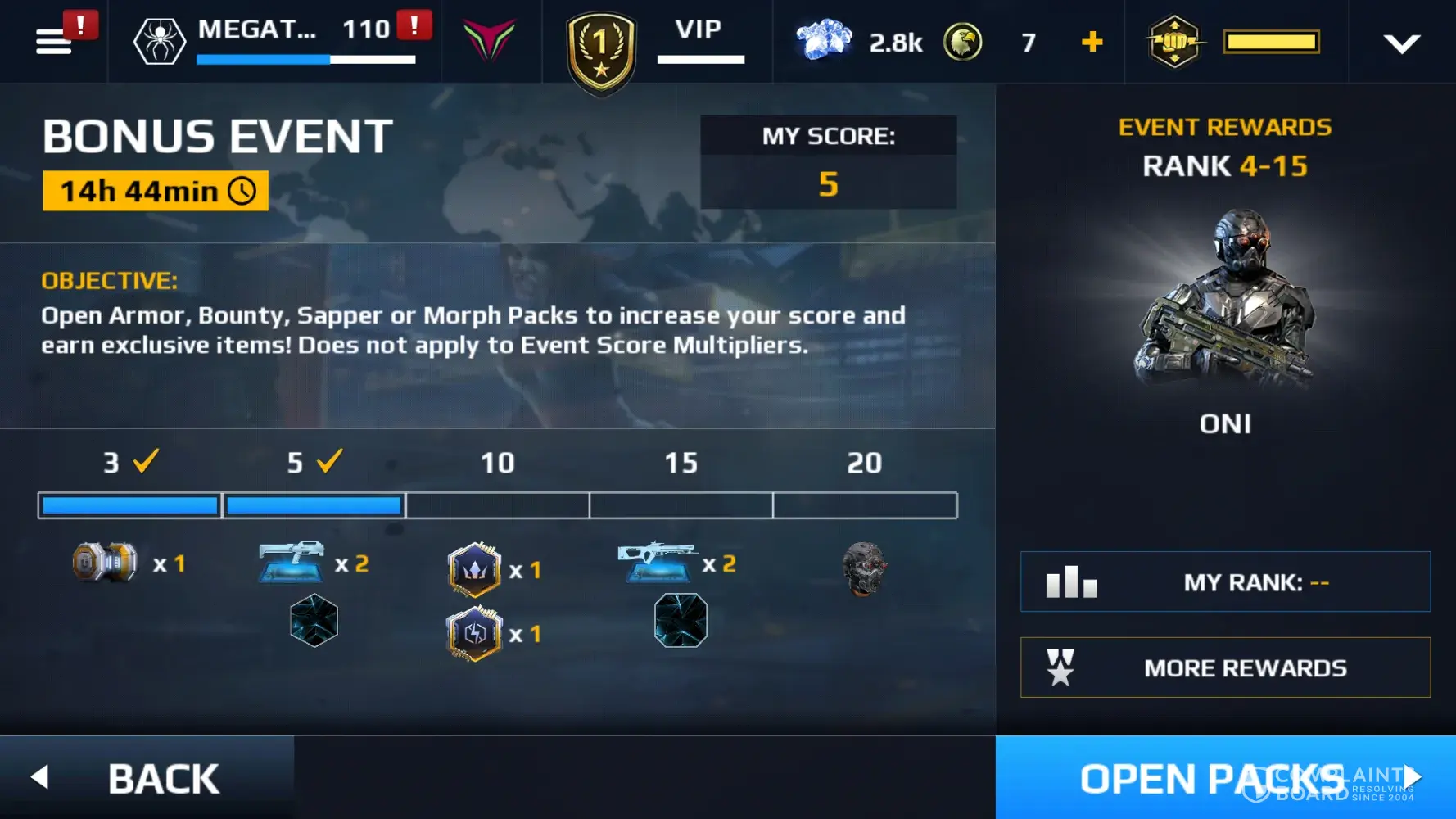 I completed the bonus event as in the bonus event I opened 5 bounty packs and as per opening them I will awarded navy oni camo and 2 blueprints of firecracker but the Gameloft did't gave me anyone of them dated 11/6/17.